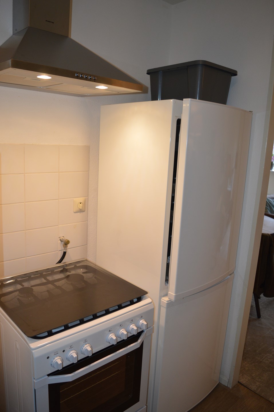 De half open keuken is voorzien van een gasoven, gasfornuis, afzuigkap en een koel/vries combinatie.