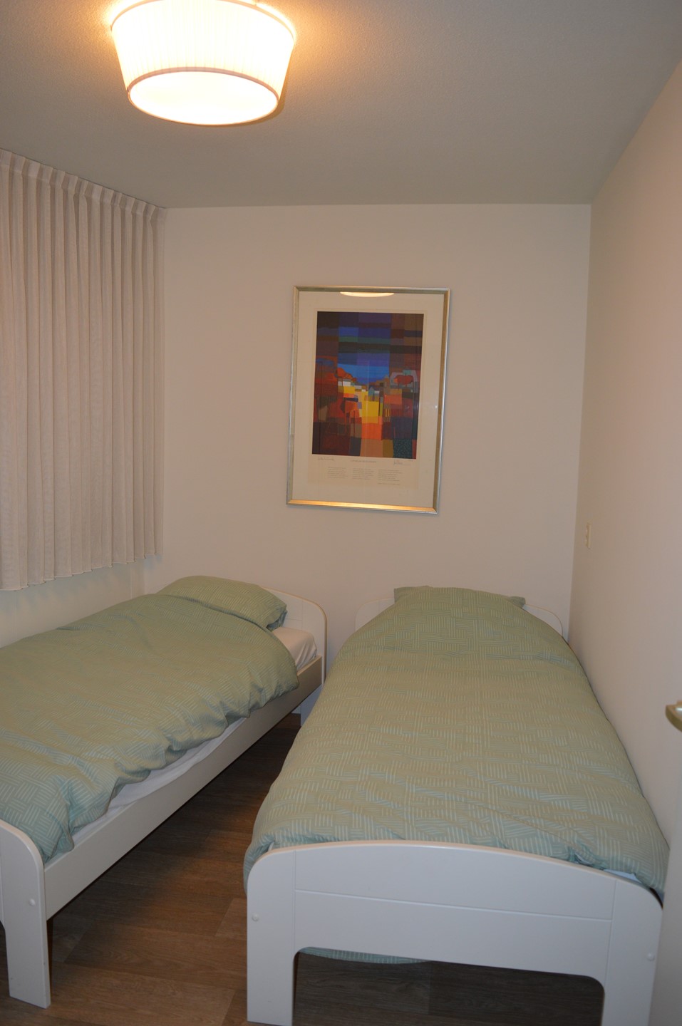 Het separate toilet is voorzien van een vloercloset en een fonteintje. Twee slaapkamers waarvan de master bedroom beschikt over een groot 2-persoonsbed en een kledingkast. Deze slaapkamer is gelegen aan de tuinzijde. De andere slaapkamer is wat kleiner en beschikt over twee 1-persoonsbedden.
