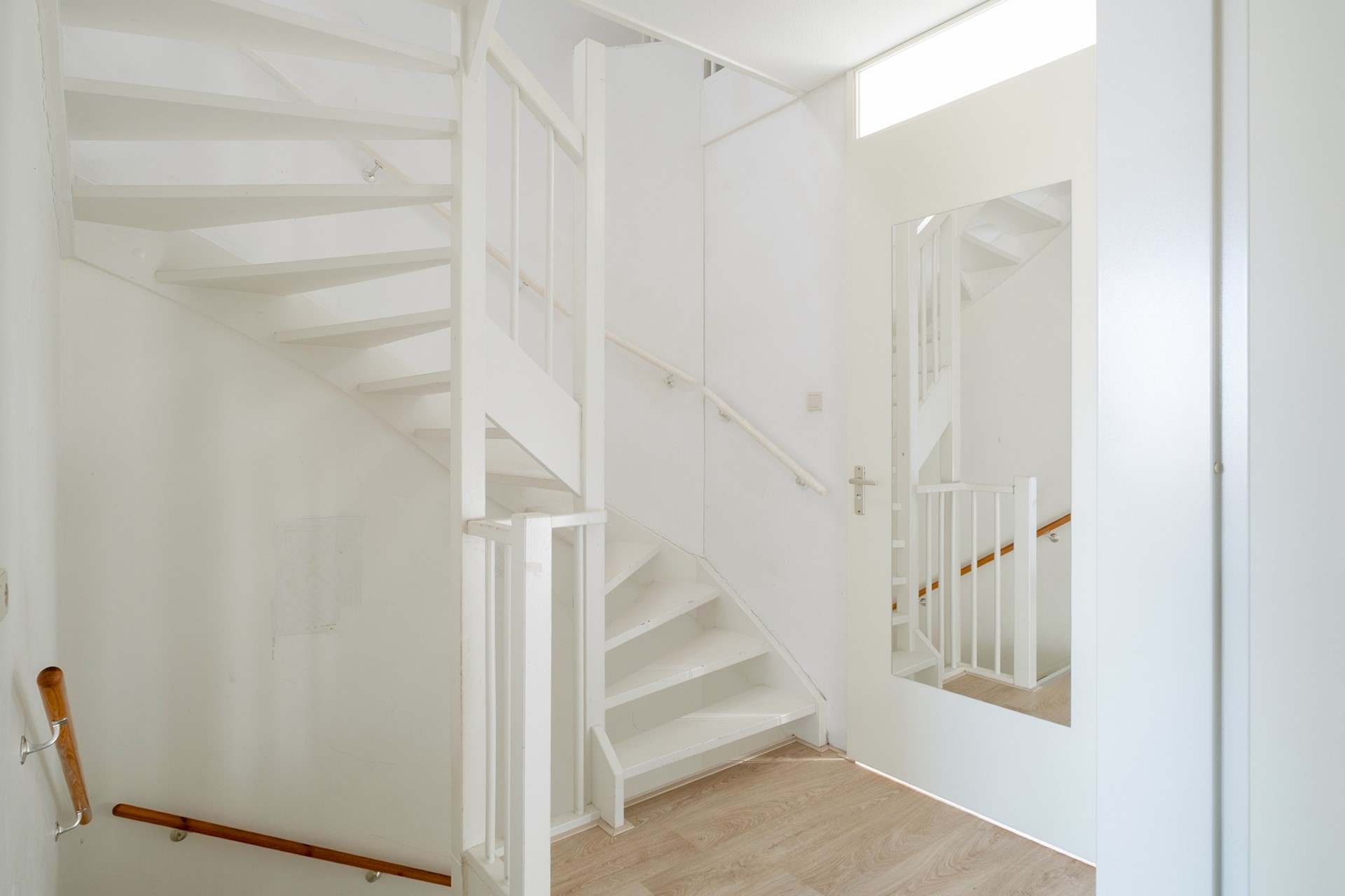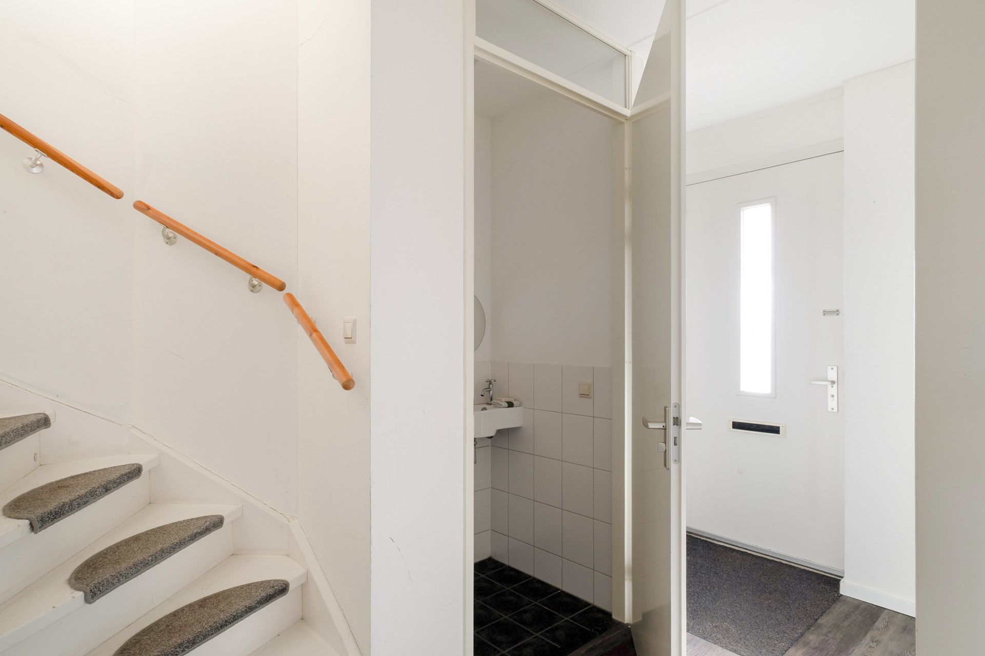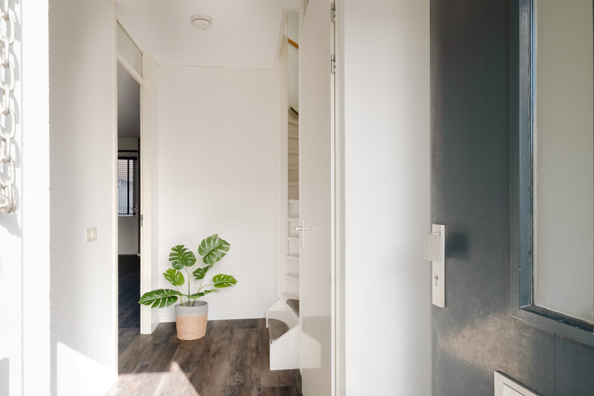 Via de entree kom je binnen in de hal met toiletruimte, meterkast en trapopgang naar de verdieping. Vanuit hier stap je de woonkamer binnen – een fijne, lichte leefruimte waar je je al snel thuis zult voelen. Dankzij de grote raampartijen valt het daglicht hier mooi naar binnen en ontstaat er een prettige, open sfeer.
