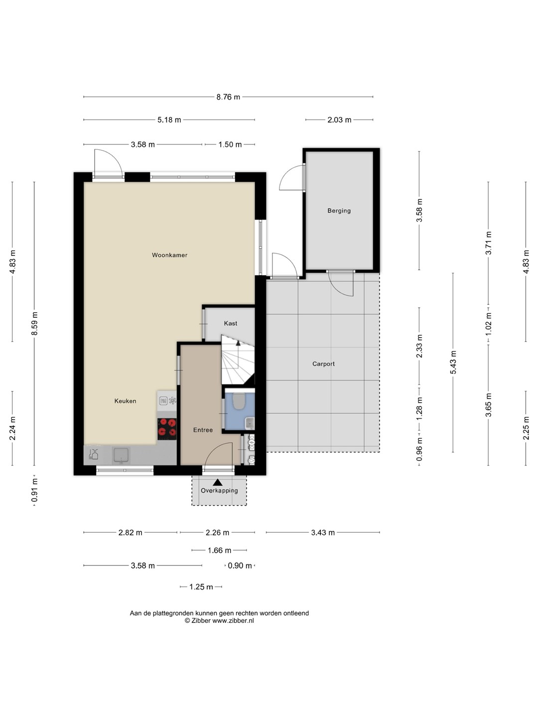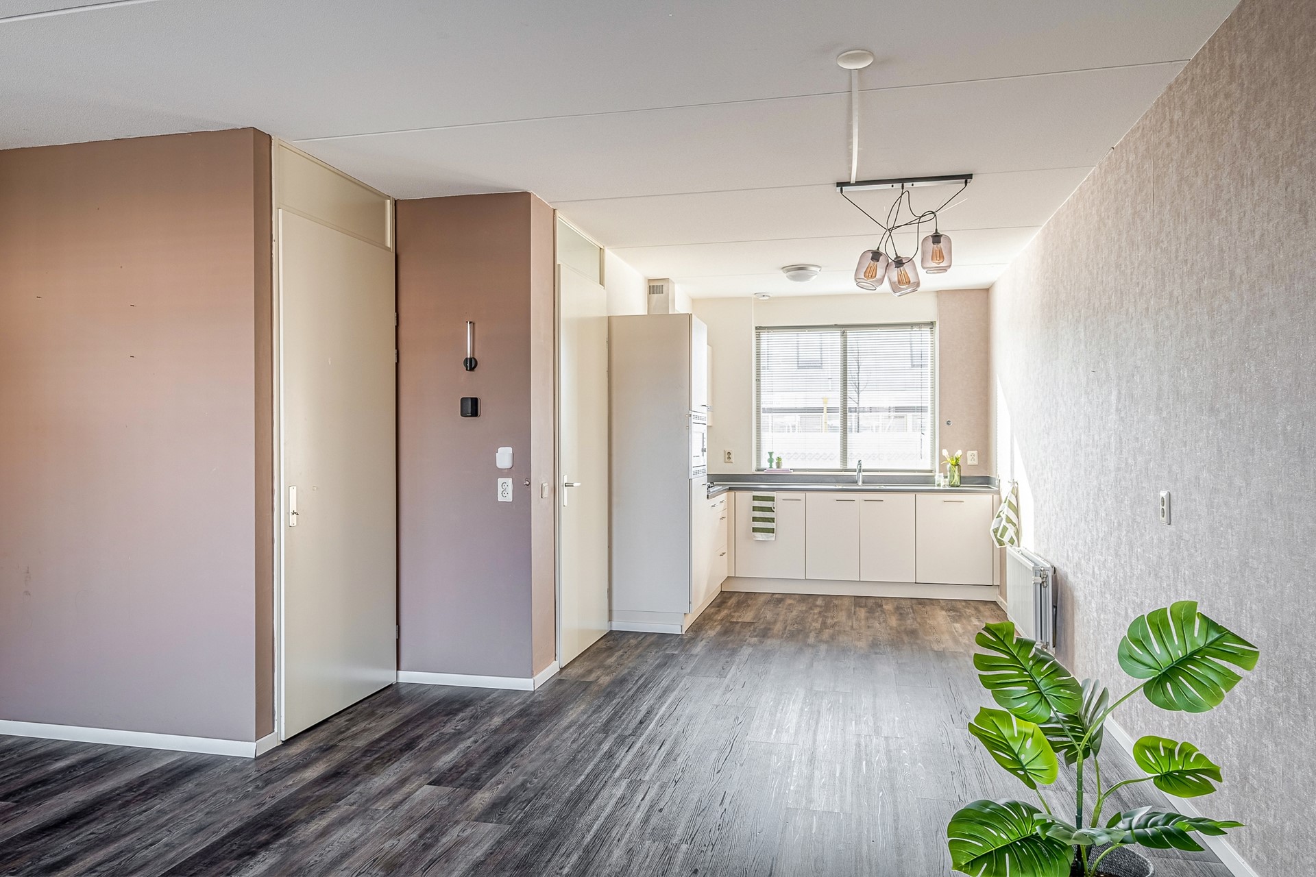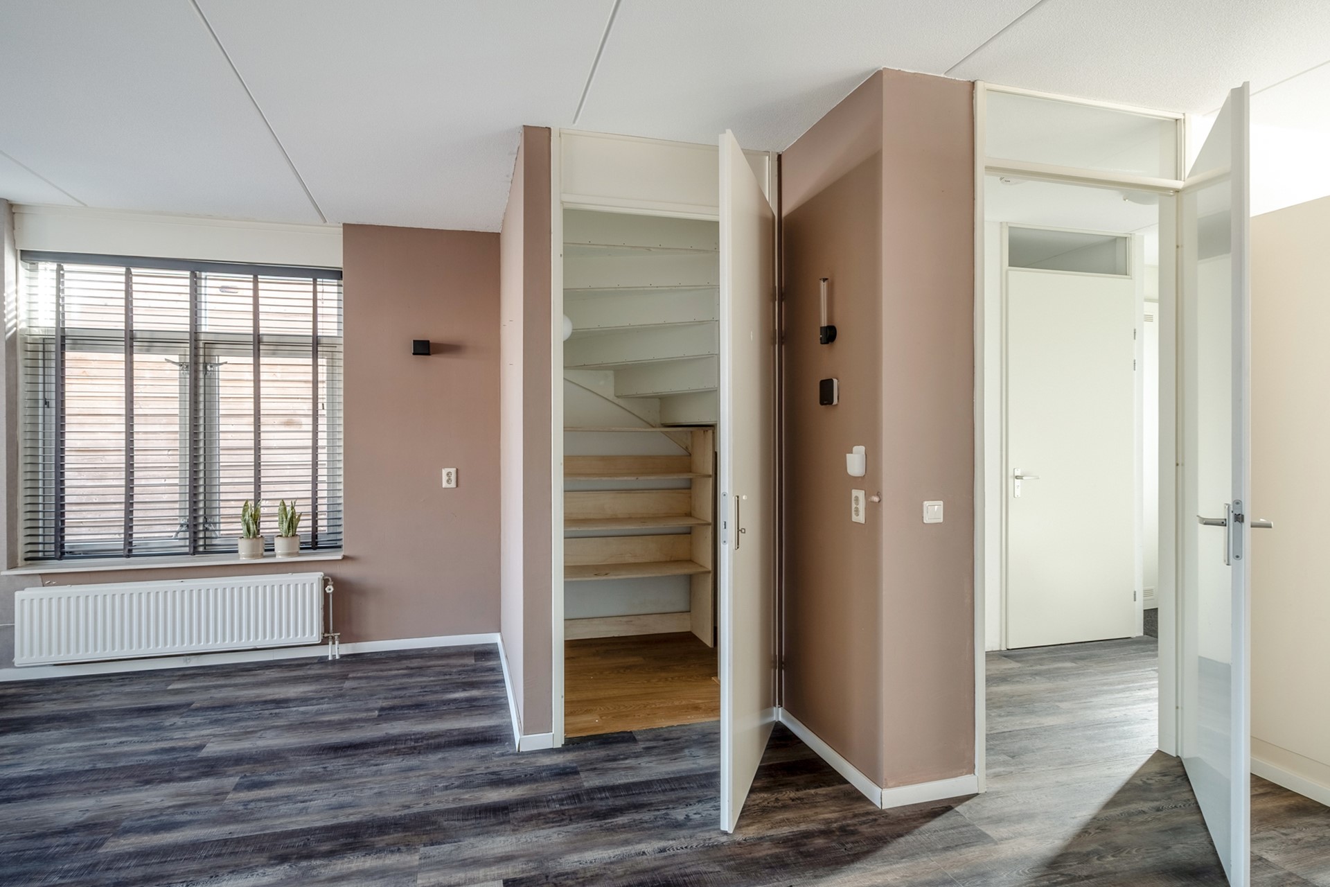 Via de entree kom je binnen in de hal met toiletruimte, meterkast en trapopgang naar de verdieping. Vanuit hier stap je de woonkamer binnen – een fijne, lichte leefruimte waar je je al snel thuis zult voelen. Dankzij de grote raampartijen valt het daglicht hier mooi naar binnen en ontstaat er een prettige, open sfeer.