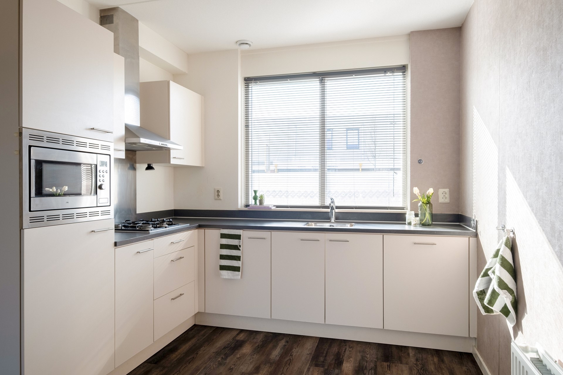 De keuken bevindt zich aan de voorzijde van de woning en is praktisch ingericht met diverse apparatuur en voldoende werkruimte. Hier kook je met gemak een snelle doordeweekse maaltijd of een uitgebreid diner in het weekend.