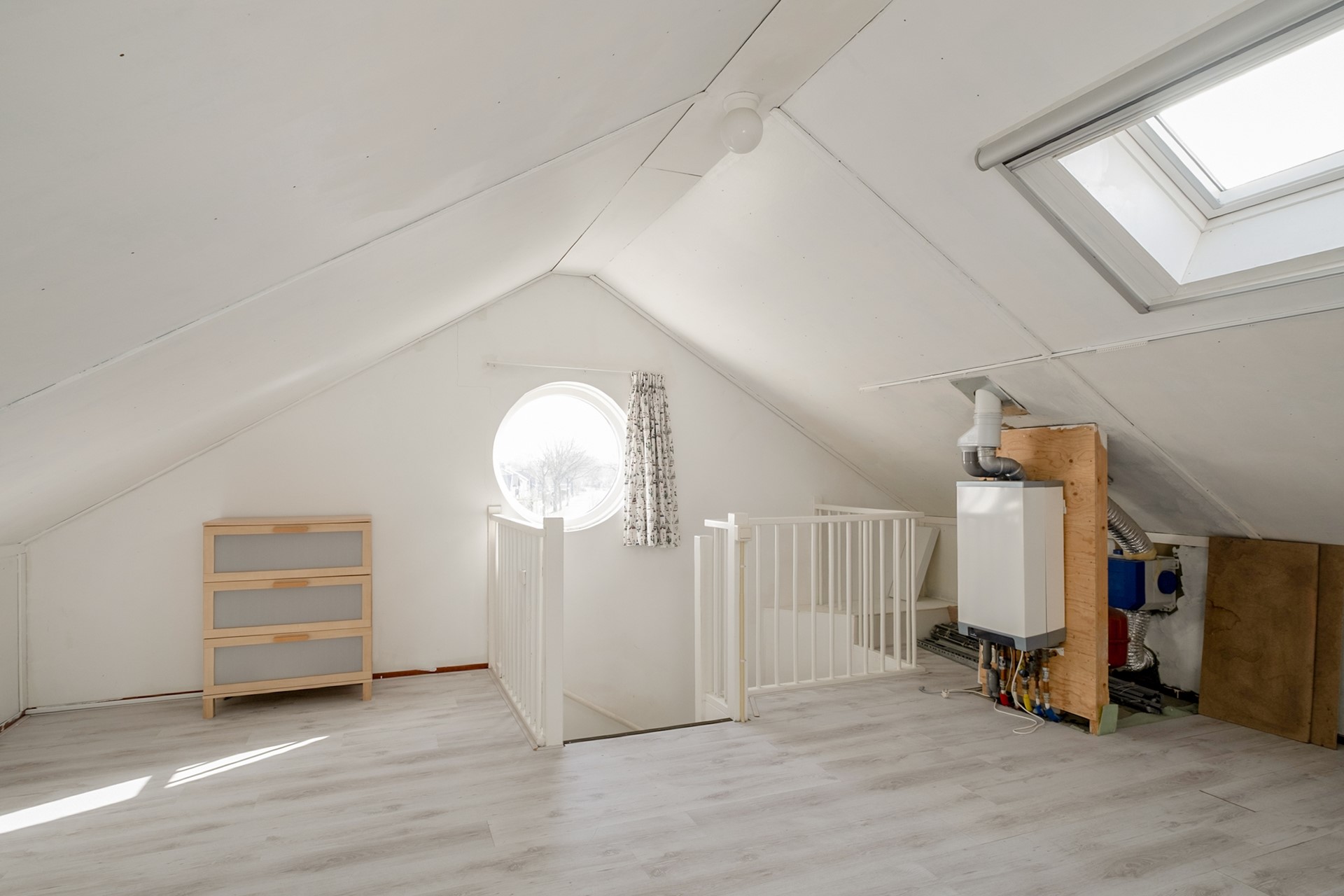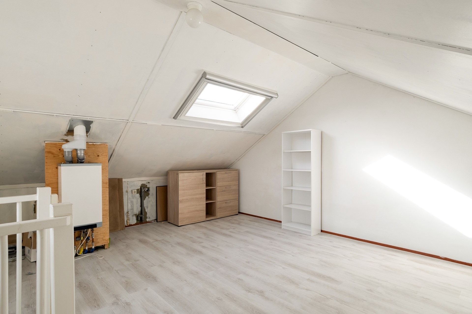 Via een vaste trap bereik je de tweede verdieping. Deze ruime zolderverdieping biedt volop mogelijkheden. Denk aan een extra slaapkamer, een rustige werkplek of een hobbyruimte. Naast de ruimte voor een extra slaapkamer bevindt zich op zolder de opstelplaats van de combiketel en de wasmachine, daarnaast is er praktische bergruimte aanwezig. Dankzij het schuine dak heeft deze verdieping bovendien een gezellige en karaktervolle sfeer.