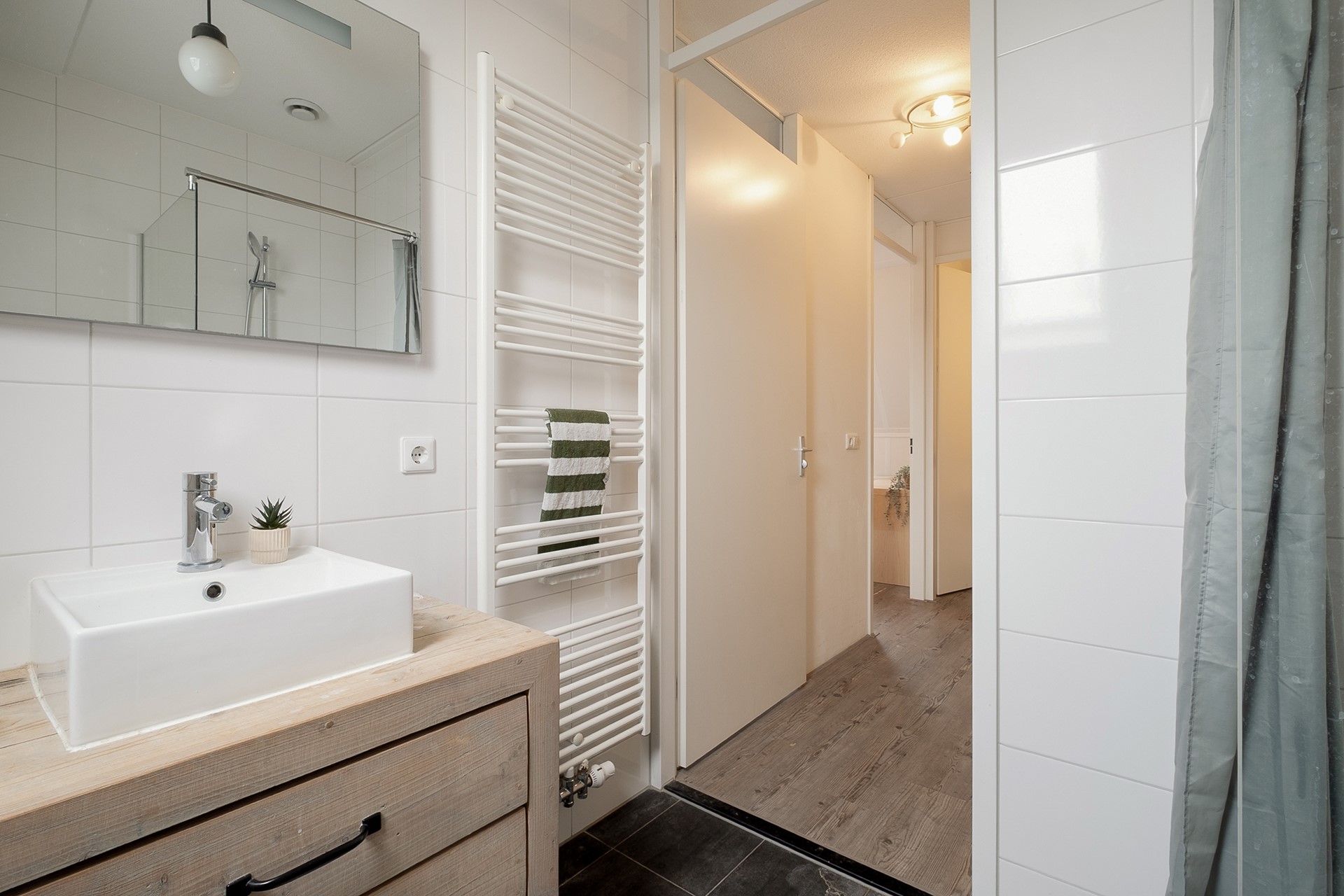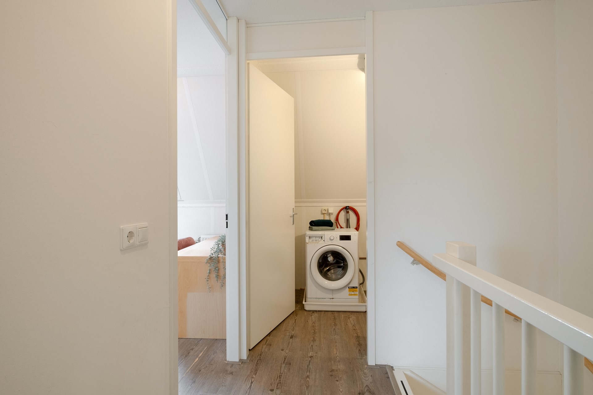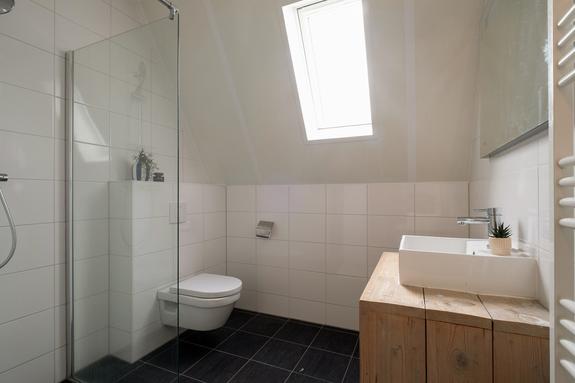 De eerste verdieping biedt een oase van rust. De twee slaapkamers zijn aangenaam van formaat, met veel daglicht. De kamers hebben een moderne uitstraling, naast de slaapkamer kan de 2e kamer gebruikt worden als fijne werkplek of een mooie kinderkamer. Vanuit de slaapkamers heb je uitzicht op het plein of op de tuin. De moderne badkamer bevindt zich eveneens op de eerste verdieping en beschikt over een wastafelmeubel, zwevend toilet, douche en designradiator. De extra bergruimte voor de CV, het mechanische ventilatiesysteem en de wasmachine is tevens handig voor het opbergen van extra spullen.