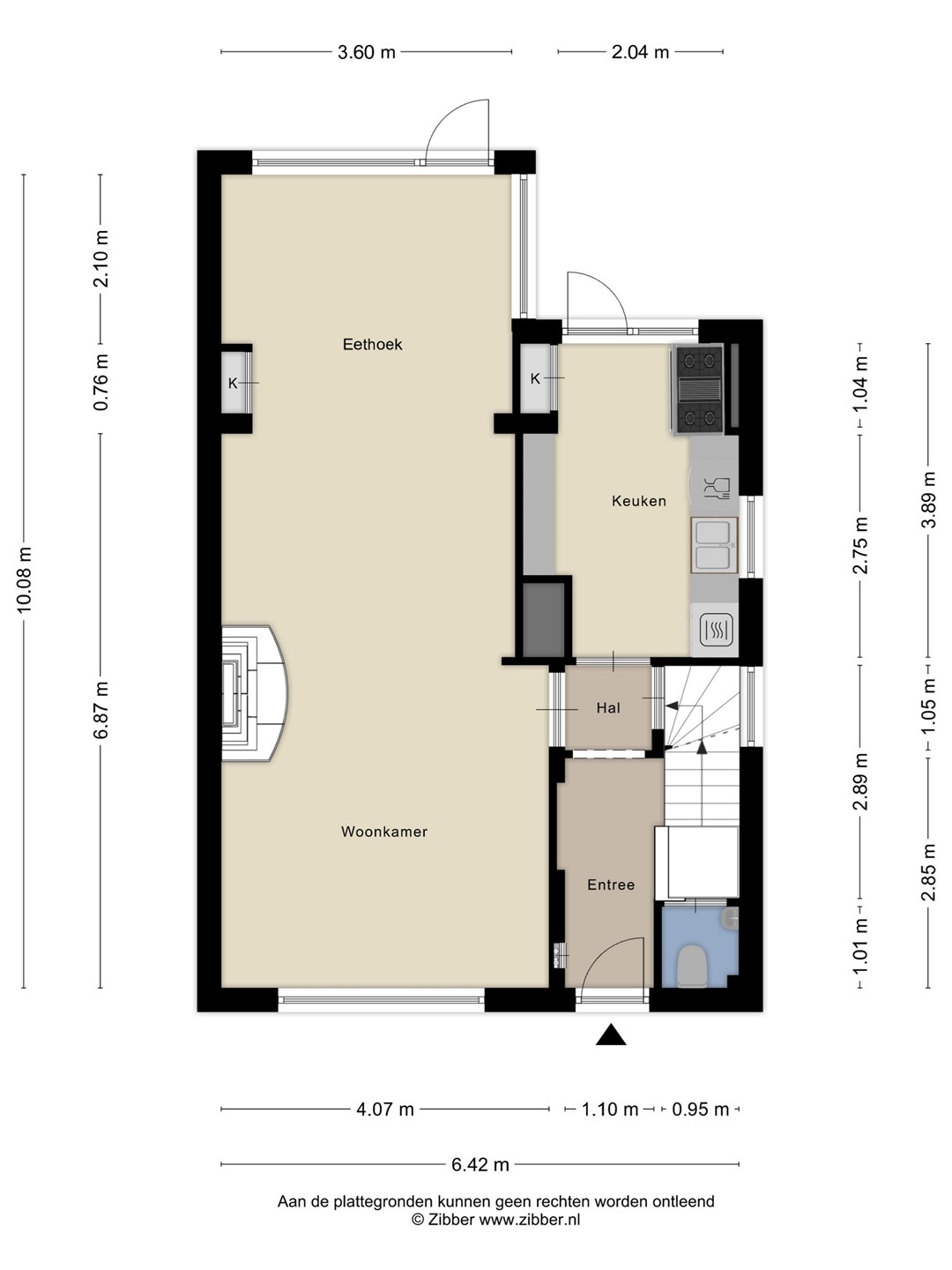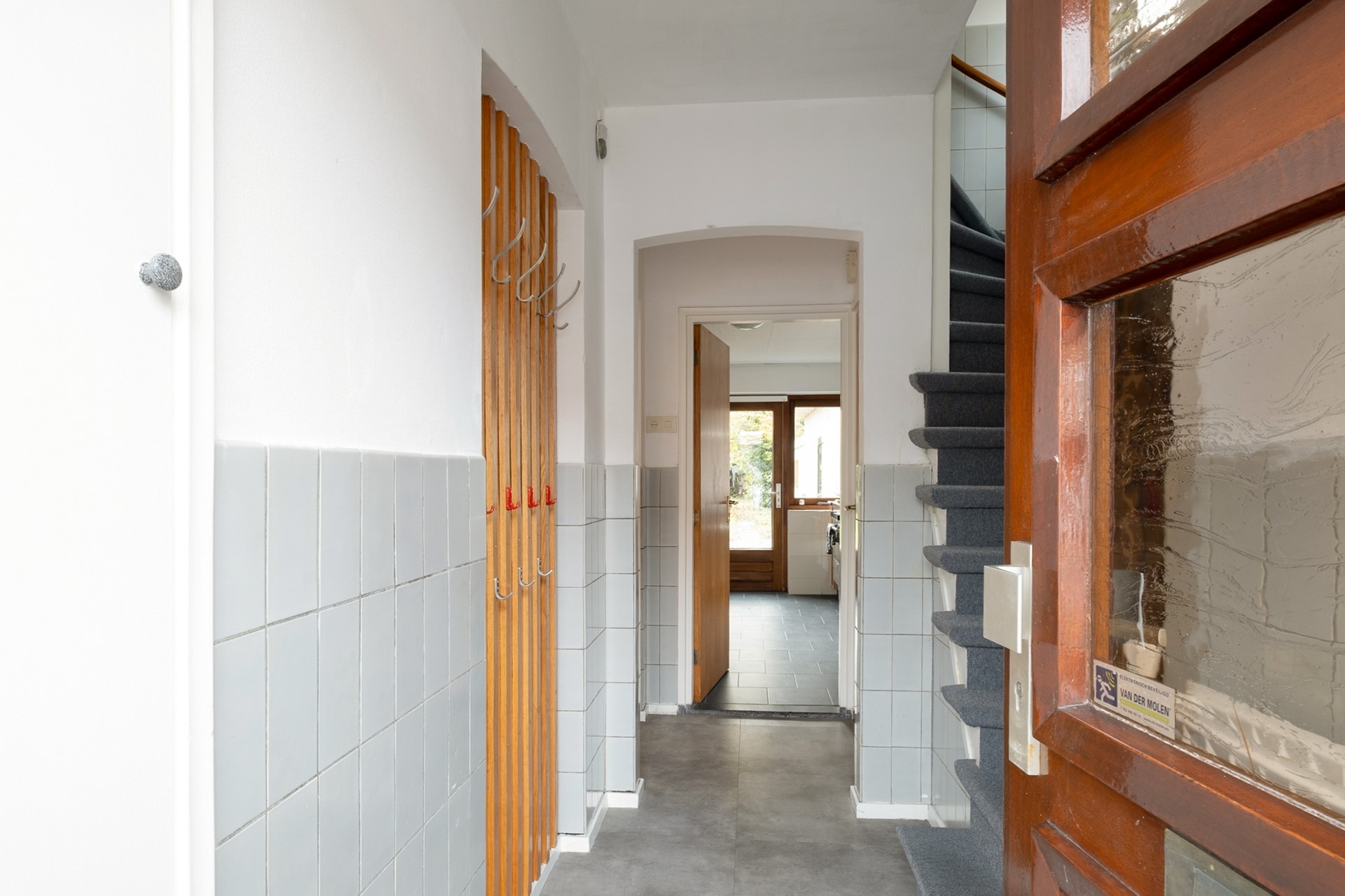 De begane grond voelt ruim en licht aan. De woonkamer strekt zich uit over de volle breedte en staat in directe verbinding met de eetkamer aan de tuinzijde. Dankzij de grote raampartijen kijk je prachtig uit op het groen. De keuken is praktisch ingedeeld en heeft een deur naar de tuin. Via de hal bereik je het toilet en de kelder — een ideale plek voor provisie of als wijnkelder.