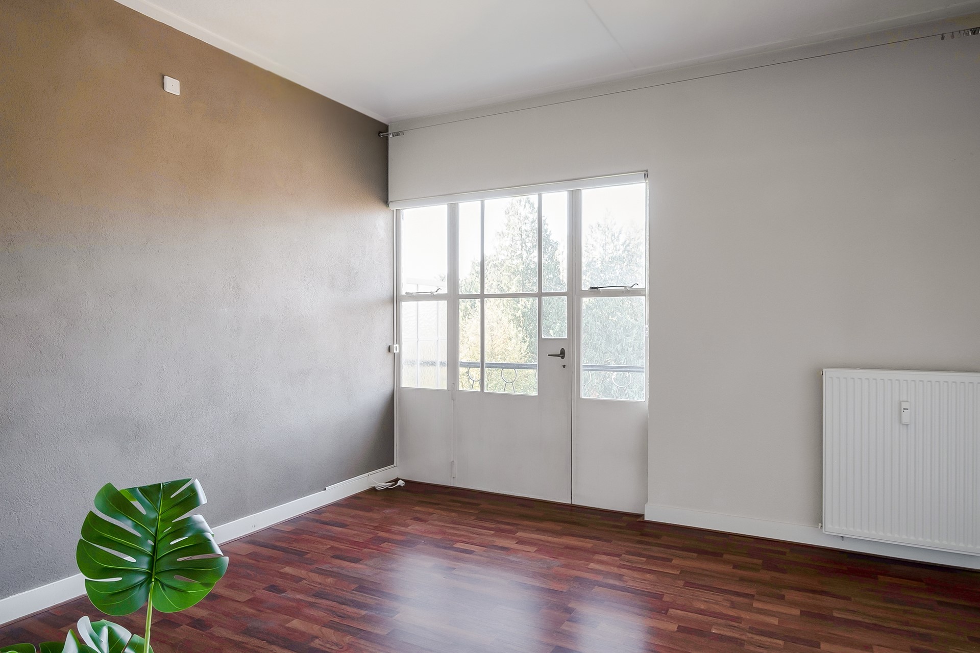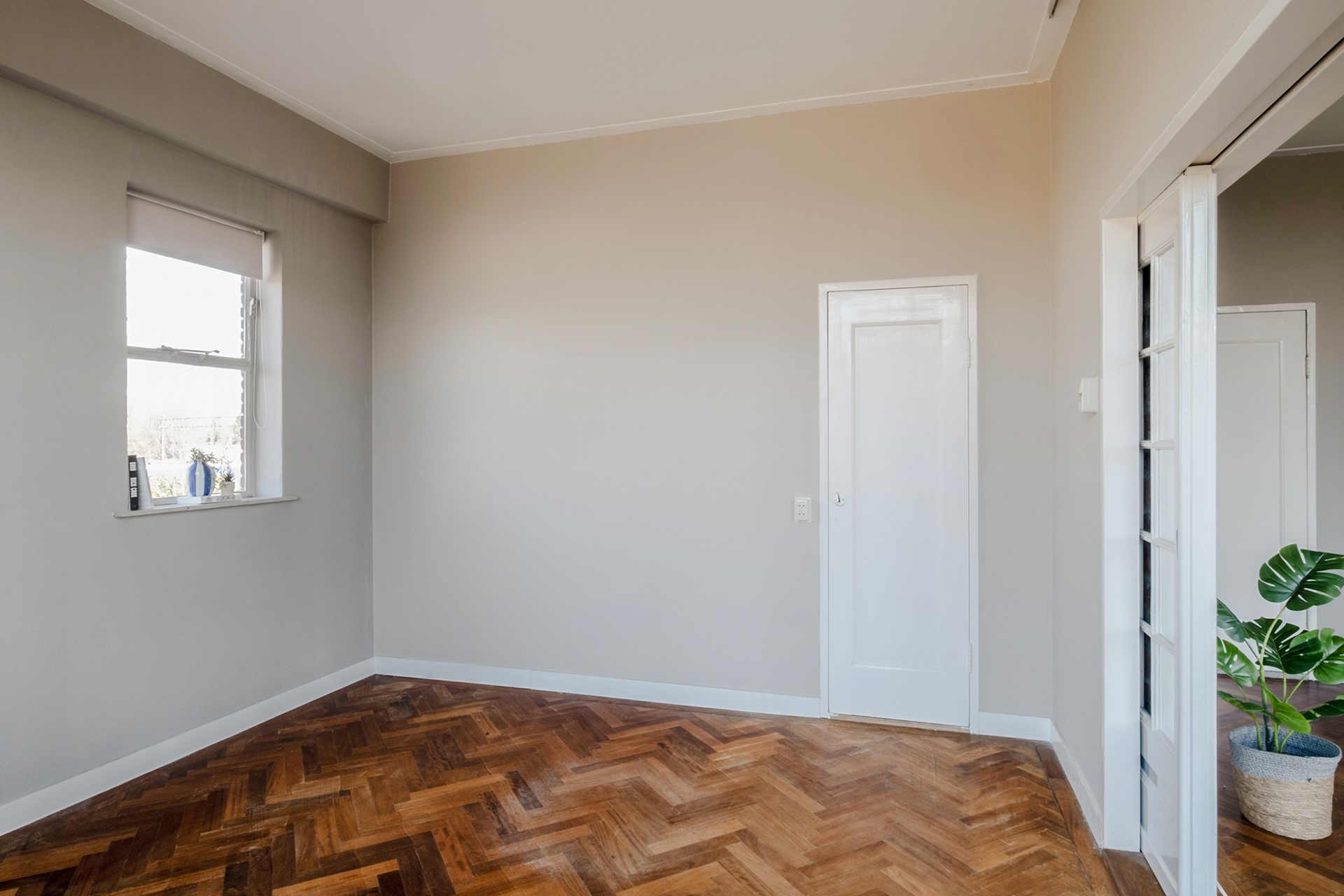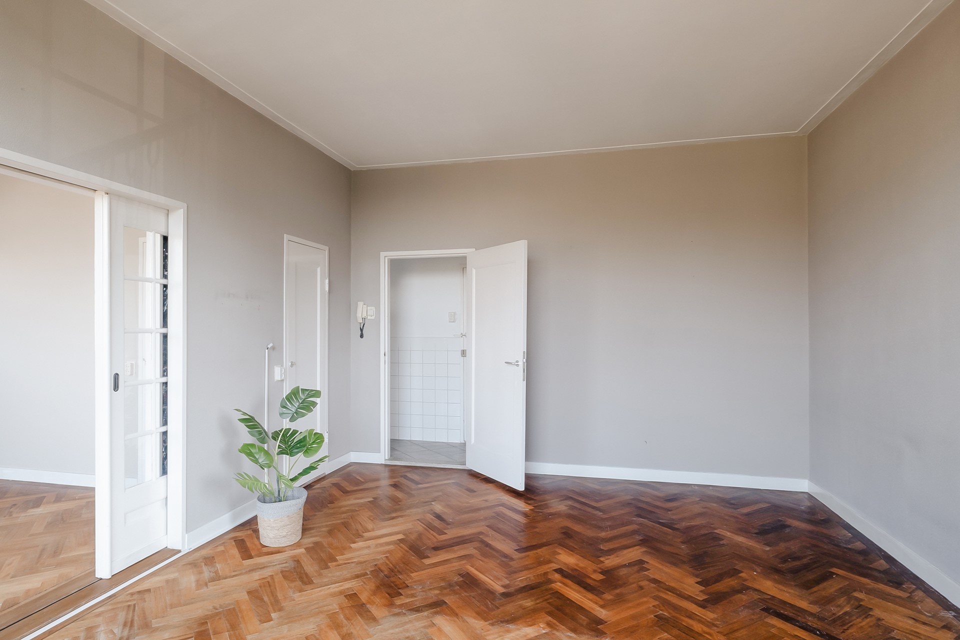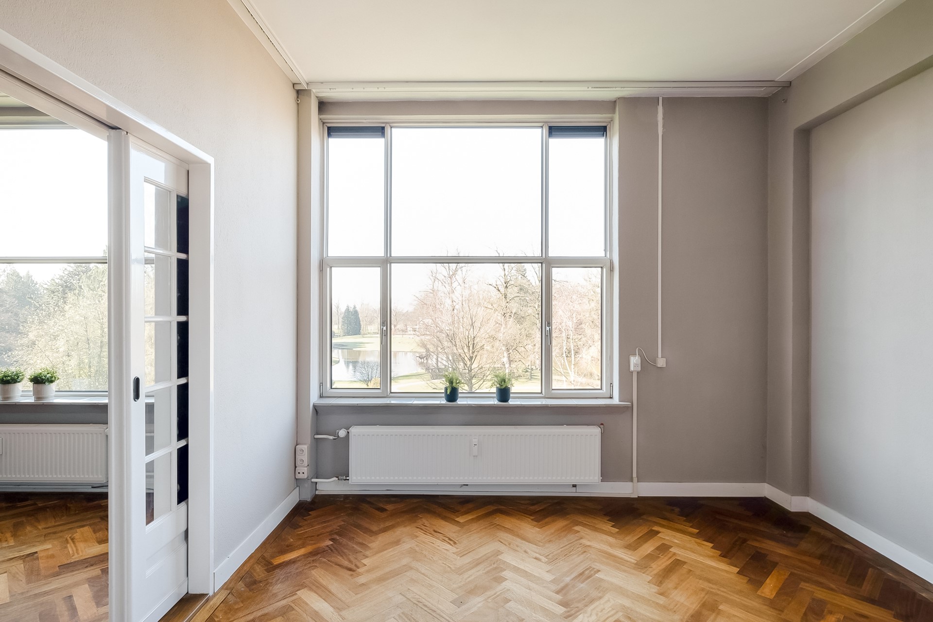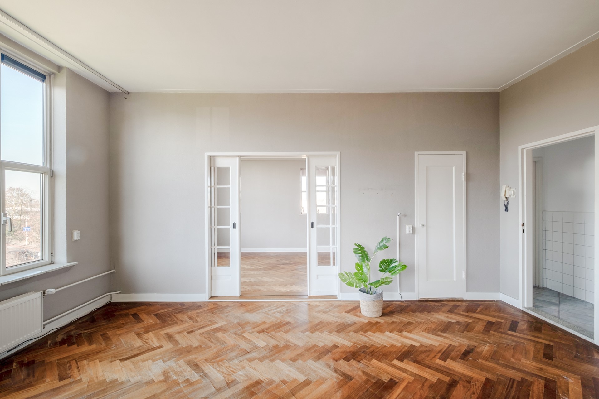 De woonkamer vormt het hart van het appartement. Dankzij de grote raampartijen valt het daglicht hier royaal naar binnen en geniet je van een prachtig, vrij uitzicht over het Volkspark. De originele suite-deuren geven de ruimte een elegant en karaktervol detail en versterken de authentieke sfeer van het appartement.