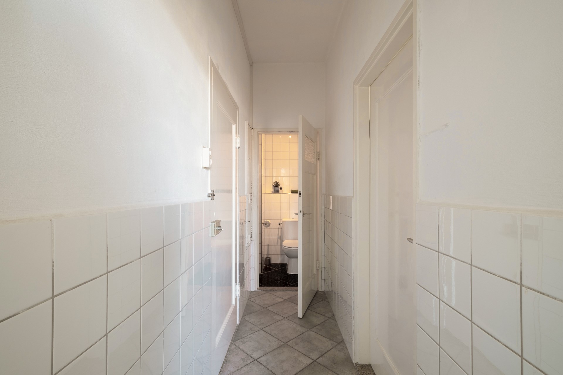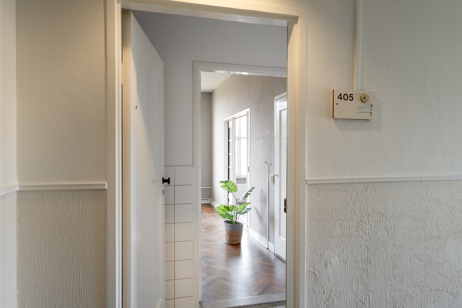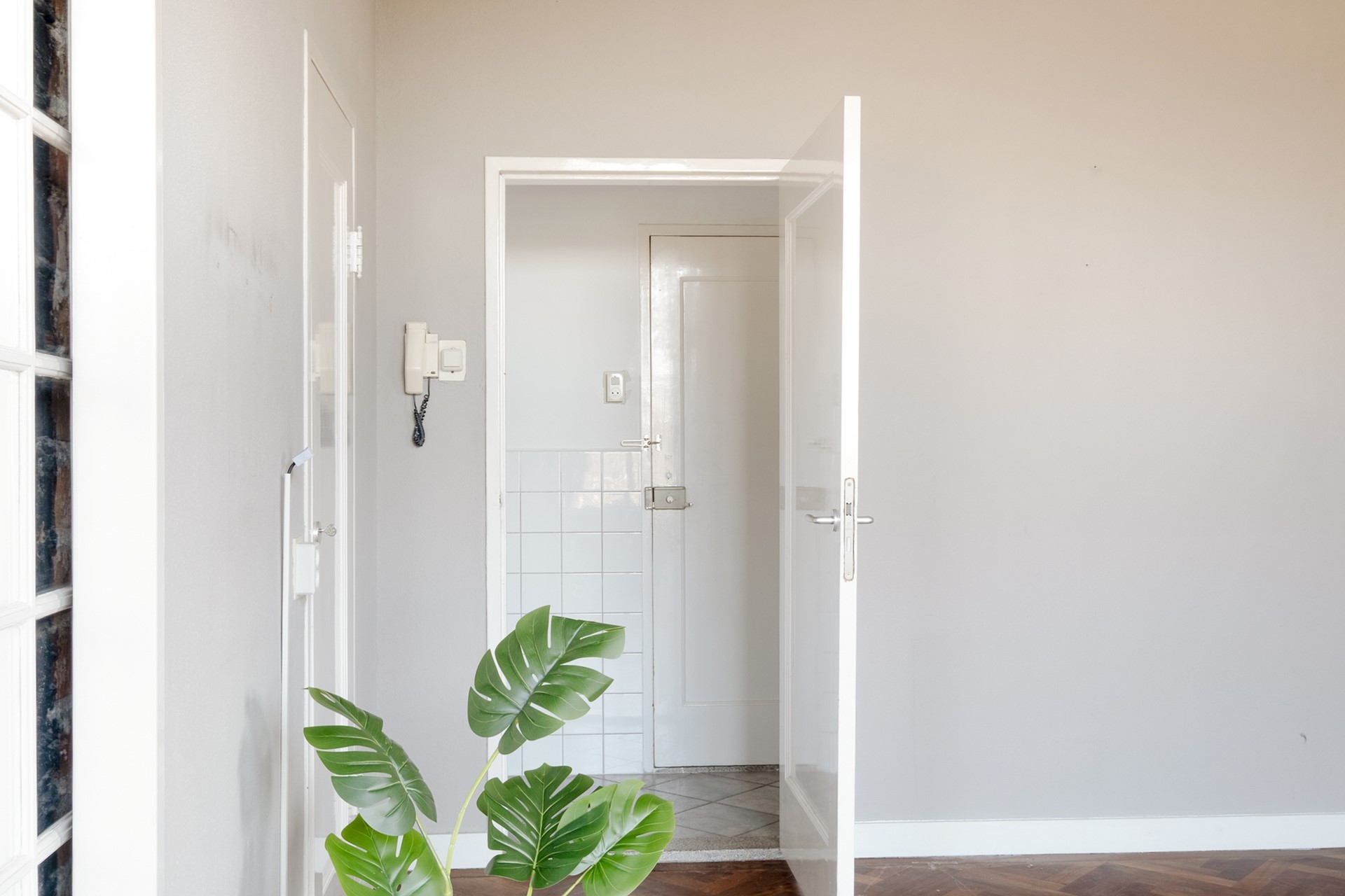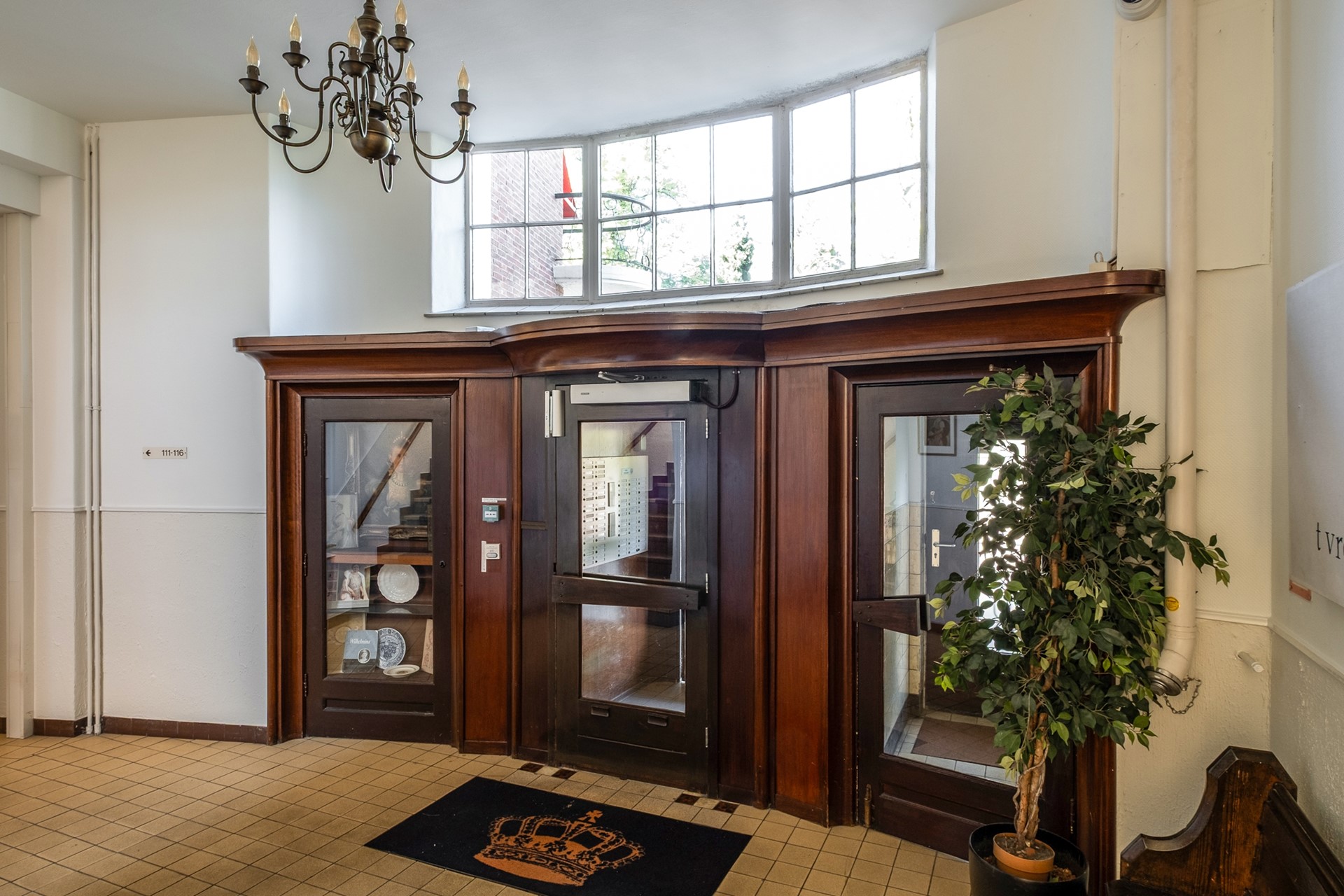 Via de statige centrale entree van het karakteristieke Koningin Wilhelmina-gebouw bereik je het appartement op de vierde verdieping. Bij binnenkomst in het appartement kom je in de hal die toegang geeft tot de verschillende vertrekken. Aan de linkerzijde bevindt zich het separate toilet met fonteintje. Aan de rechterzijde ligt de keuken. Wanneer je rechtdoor loopt, kom je in de sfeervolle woonkamer.