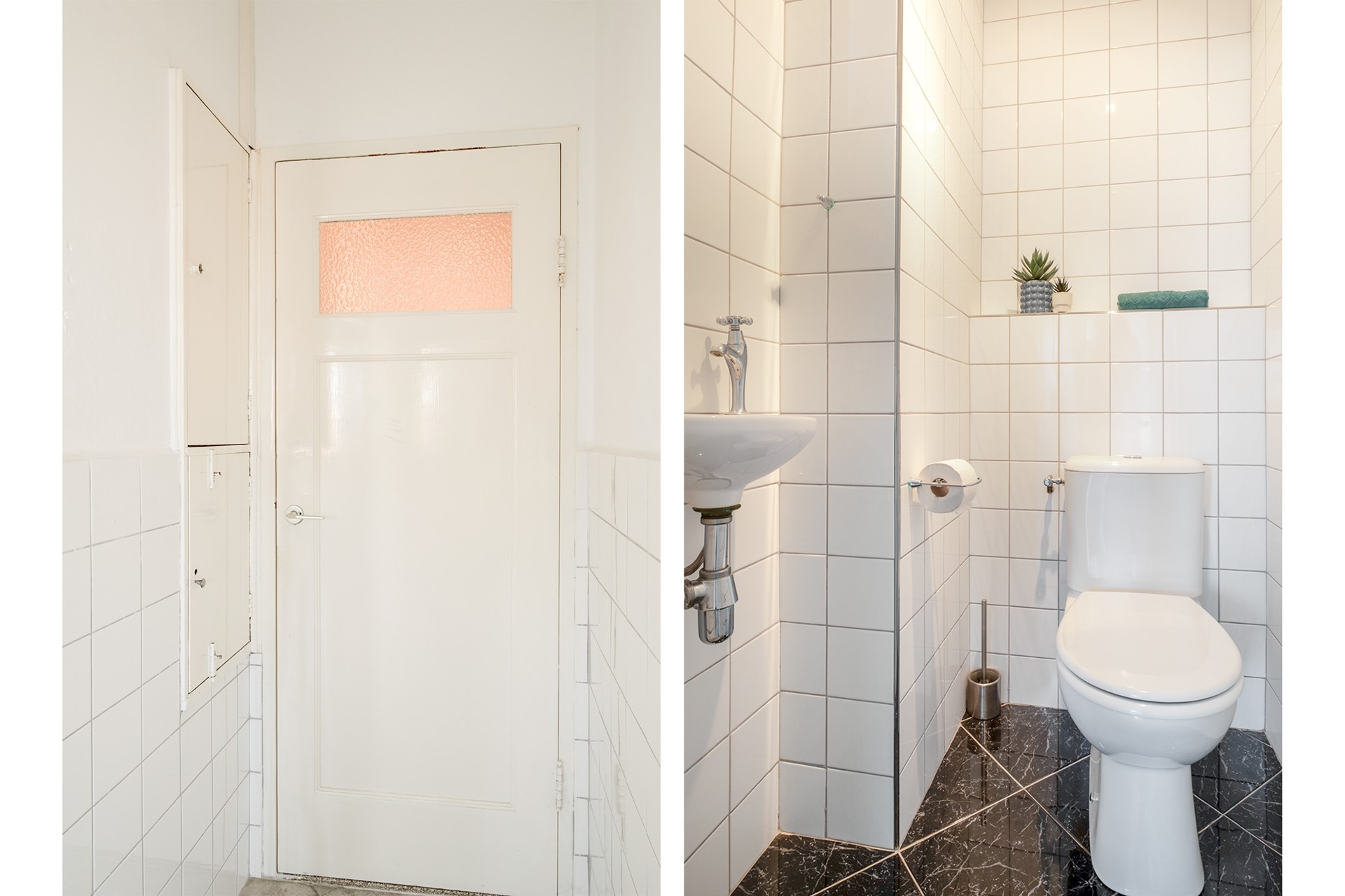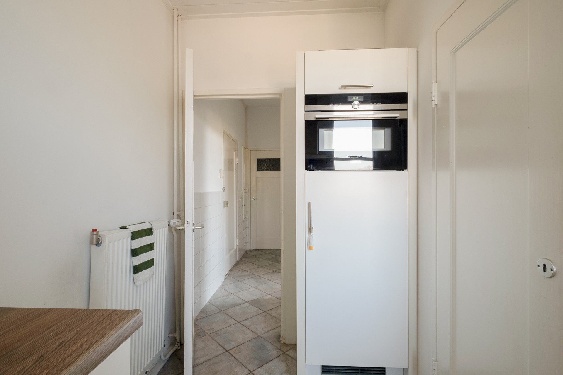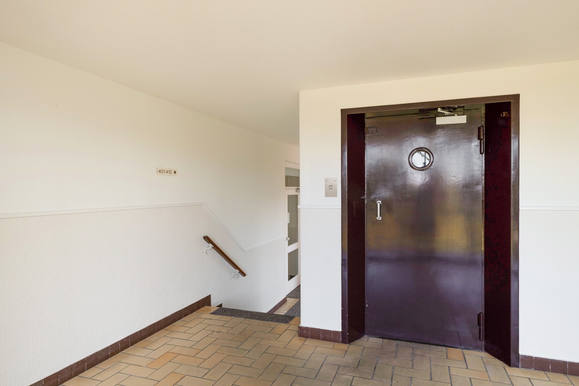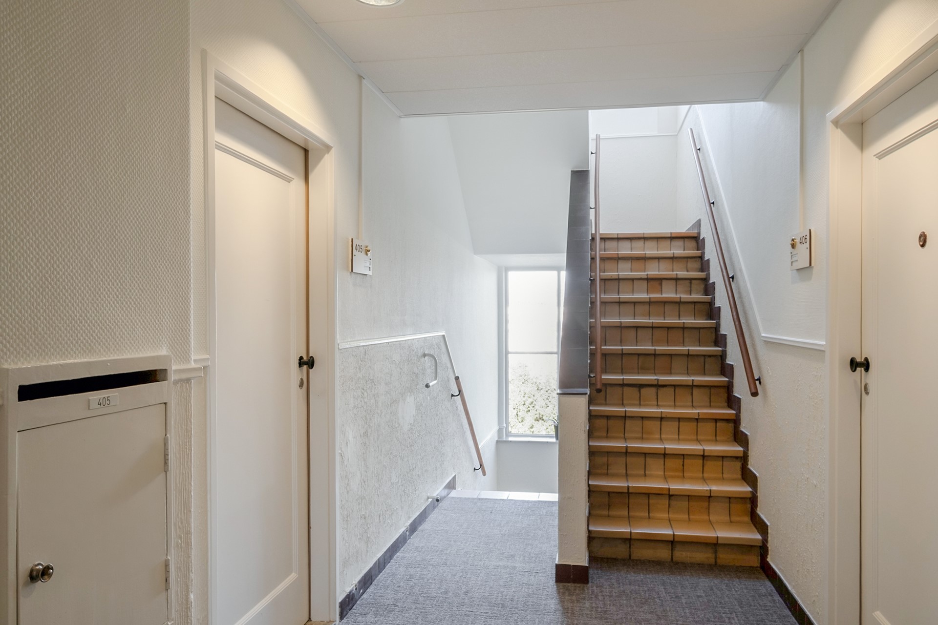 Via de statige centrale entree van het karakteristieke Koningin Wilhelmina-gebouw bereik je het appartement op de vierde verdieping. Bij binnenkomst in het appartement kom je in de hal die toegang geeft tot de verschillende vertrekken. Aan de linkerzijde bevindt zich het separate toilet met fonteintje. Aan de rechterzijde ligt de keuken. Wanneer je rechtdoor loopt, kom je in de sfeervolle woonkamer.