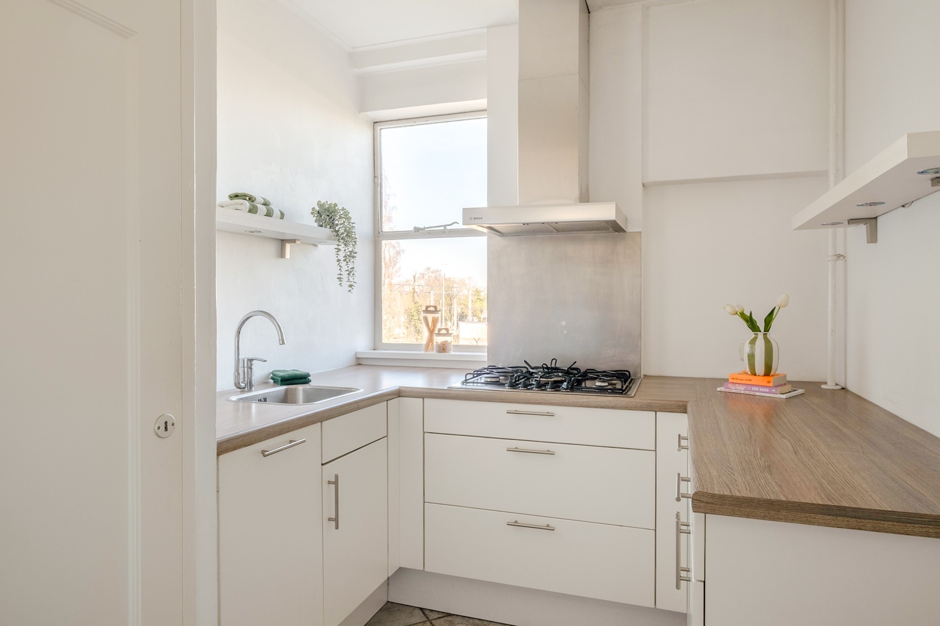 De keuken is praktisch ingericht en biedt alles wat nodig is voor dagelijks comfort, zoals een koelkast, combimagnetron, vaatwasser en gaskookplaat met afzuiging. De ruimte biedt daarnaast mogelijkheden om deze naar eigen smaak en wensen verder te moderniseren.