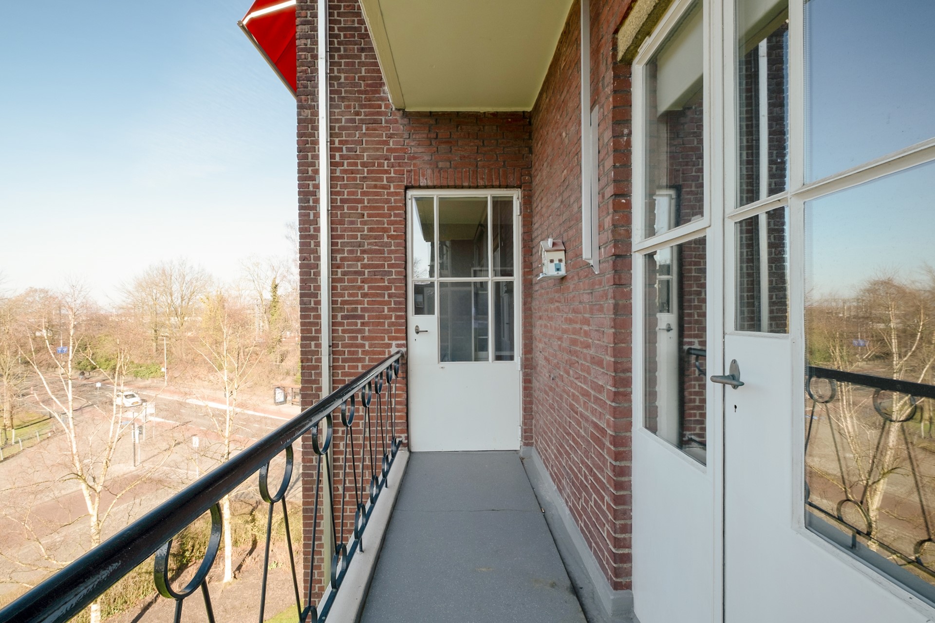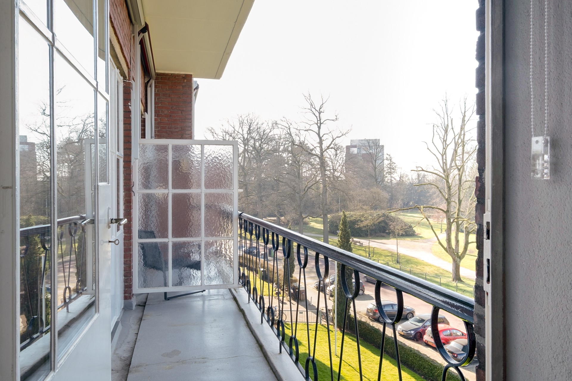 Het balkon is gunstig gelegen op het westen, waardoor je hier in de middag en avond van de zon kunt genieten. Met het groene Volkspark als uitzicht vormt dit een heerlijke plek om even buiten te zitten en de dag ontspannen af te sluiten.