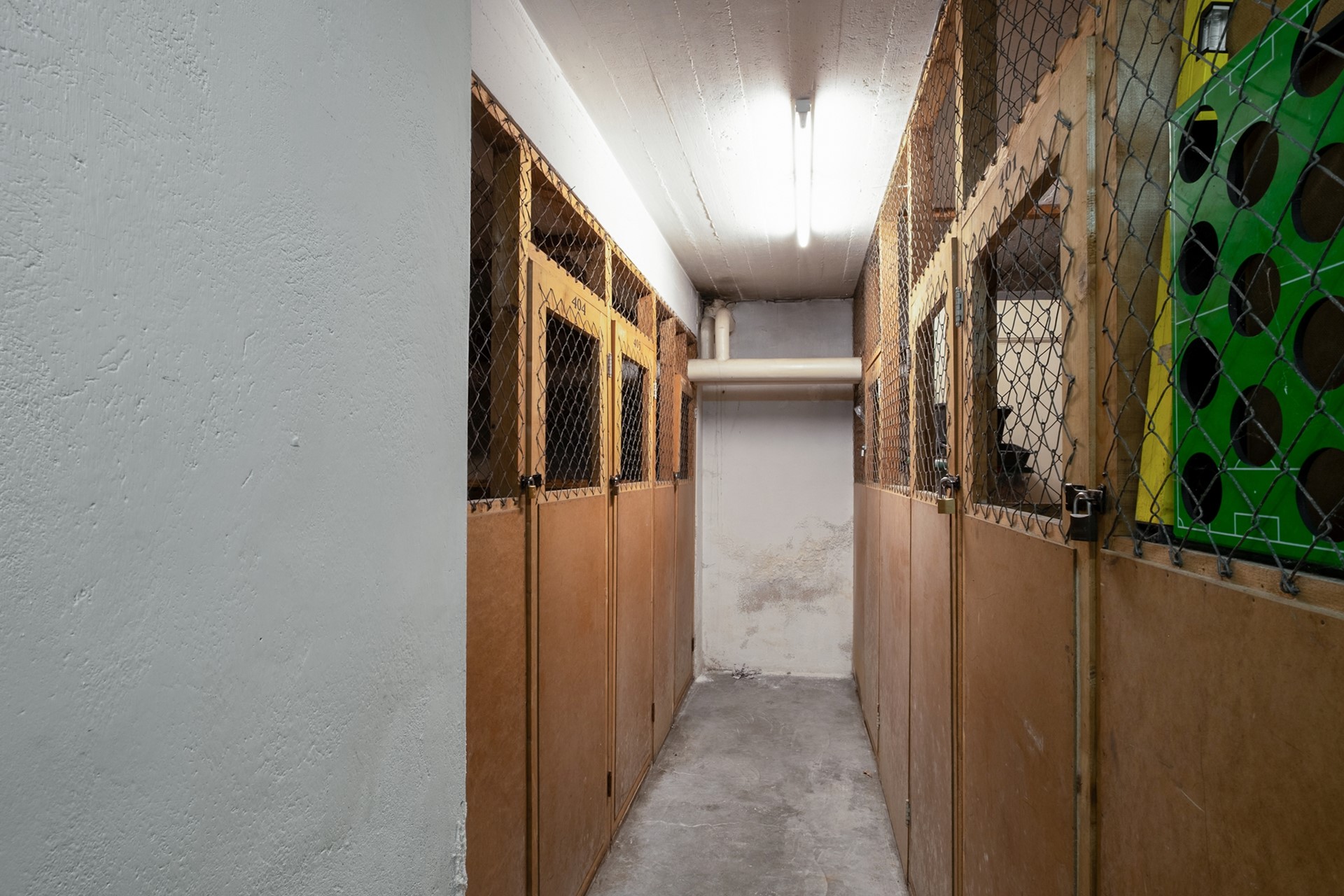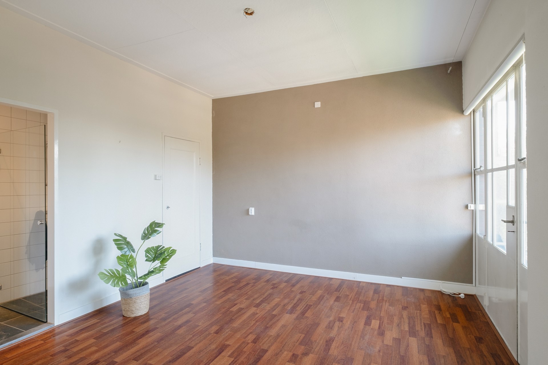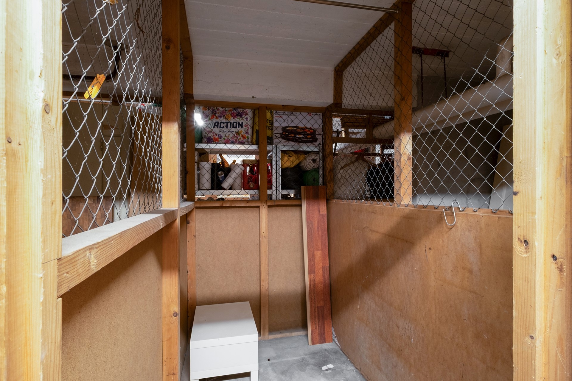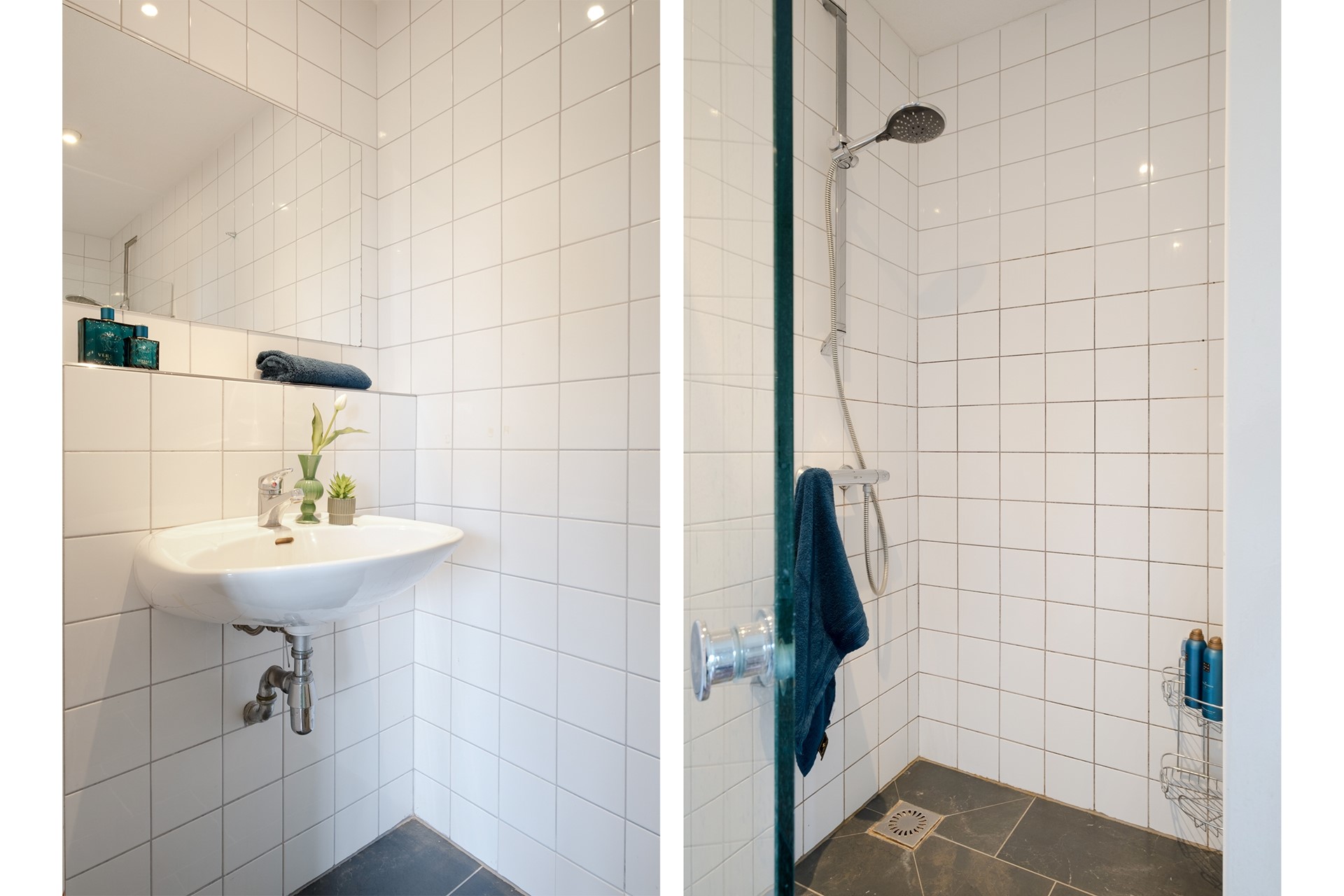 De badkamer is voorzien van een douche en wastafel en ligt centraal tussen de verschillende vertrekken. In een aparte ruimte bevindt zich de warmwaterboiler en de aansluiting voor de wasmachine.