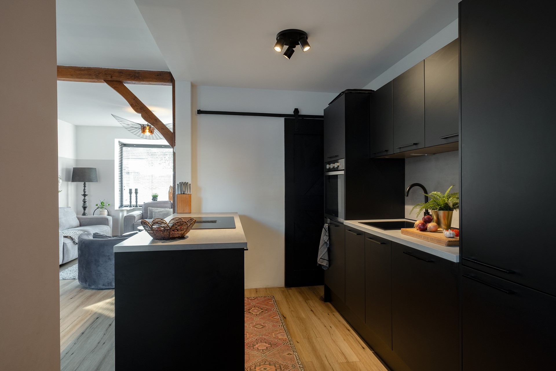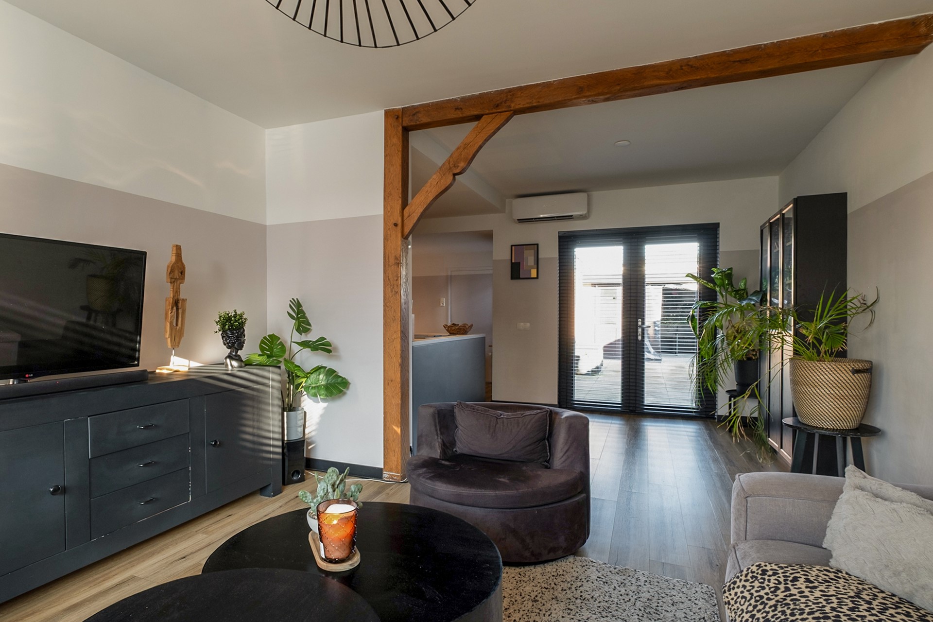 Aan de achterzijde gaat de woonkamer via de moderne keuken over in de eethoek, waardoor een open en uitnodigende leefruimte ontstaat. De keuken is strak en praktisch ingericht en vormt het hart van het huis. Vanuit hier is er een prettige verbinding met de tuin, waardoor binnen en buiten mooi in elkaar overlopen. De woonkamer is bovendien voorzien van airconditioning, waarmee zowel gekoeld als verwarmd kan worden.