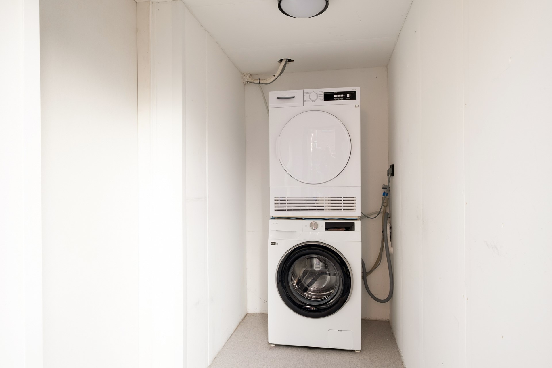 Via een gang met aansluiting voor de wasmachine bereik je de berging met elektriciteitsaansluiting, die samen met de woning is verbonden door middel van een patio. Deze opzet zorgt voor een prettige overgang tussen binnen en buiten en voegt praktische bergruimte toe, zonder dat het de rust van het huis verstoort.