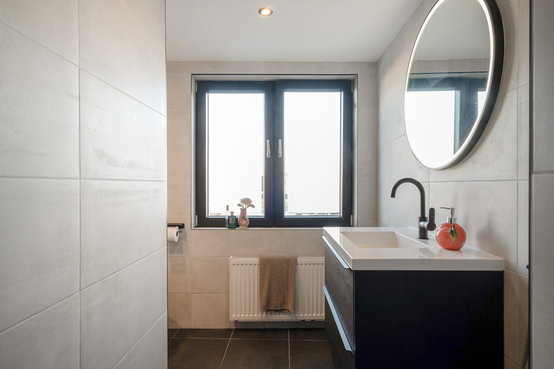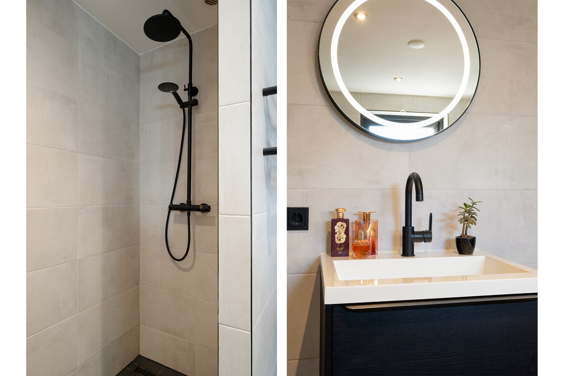 De badkamer is licht en eigentijds uitgevoerd en beschikt over een toilet, douche en wastafelmeubel. Dankzij de daglichttoetreding voelt de ruimte fris en comfortabel aan.