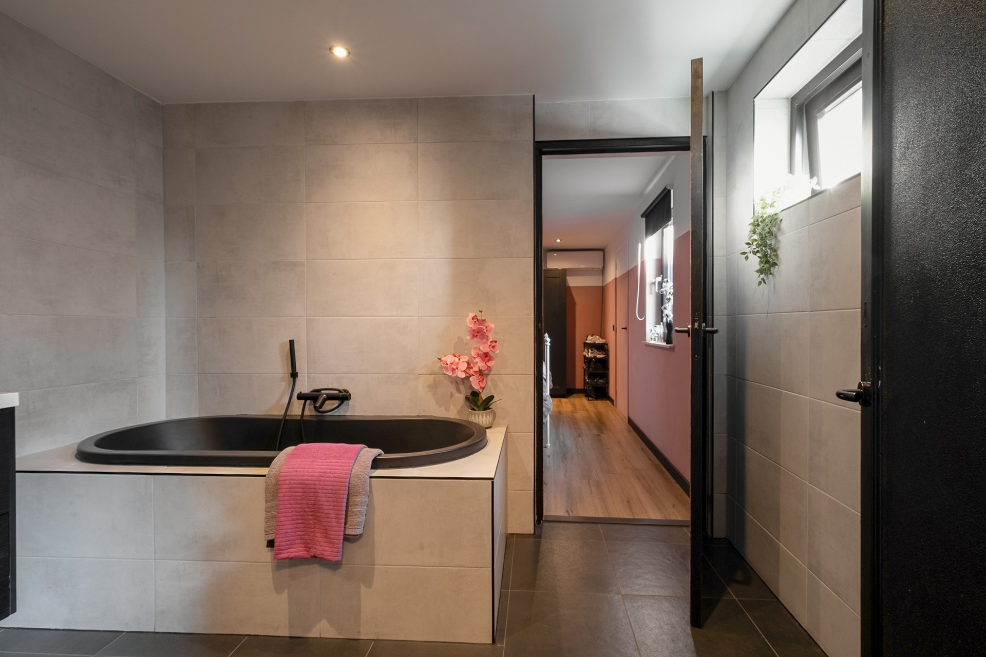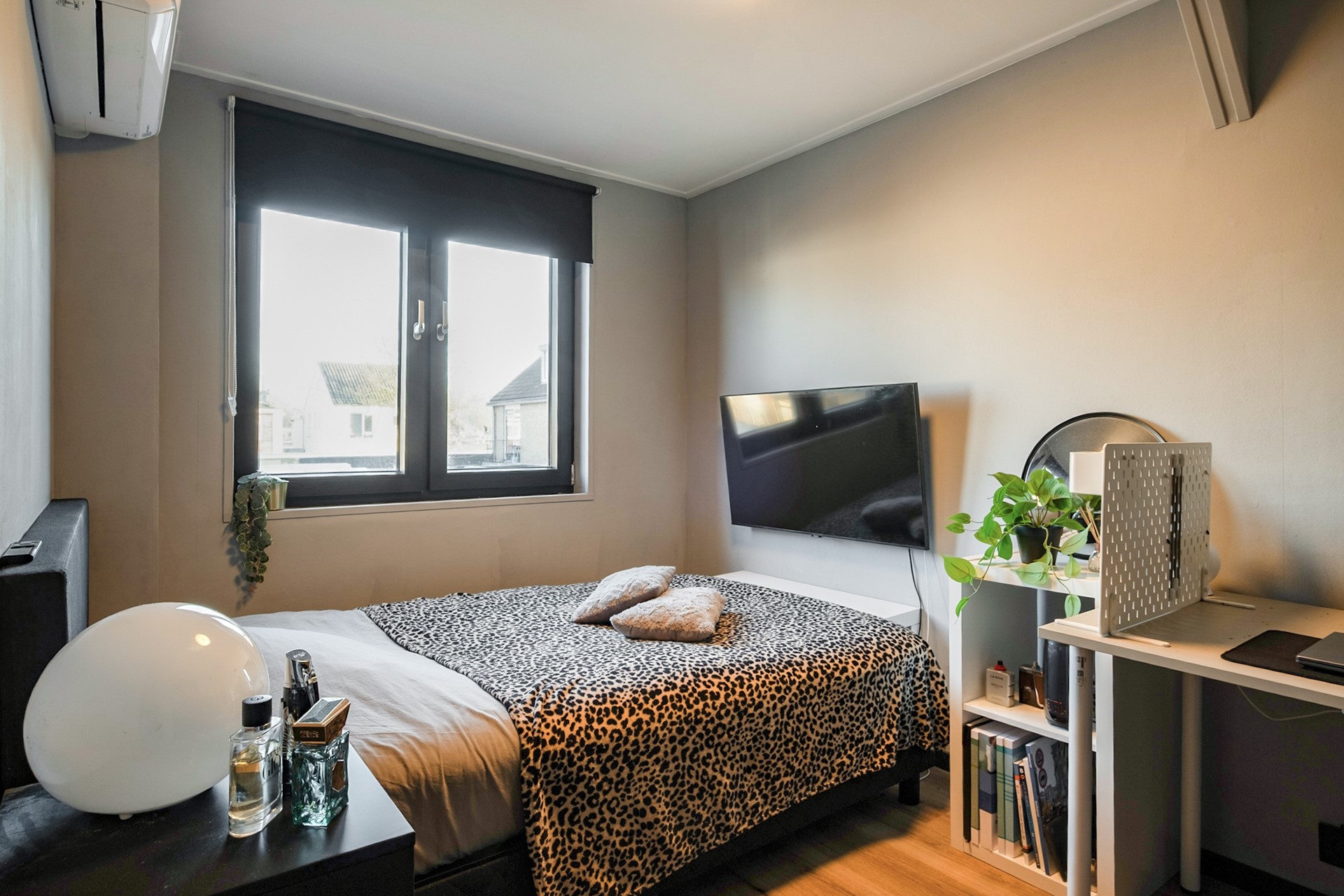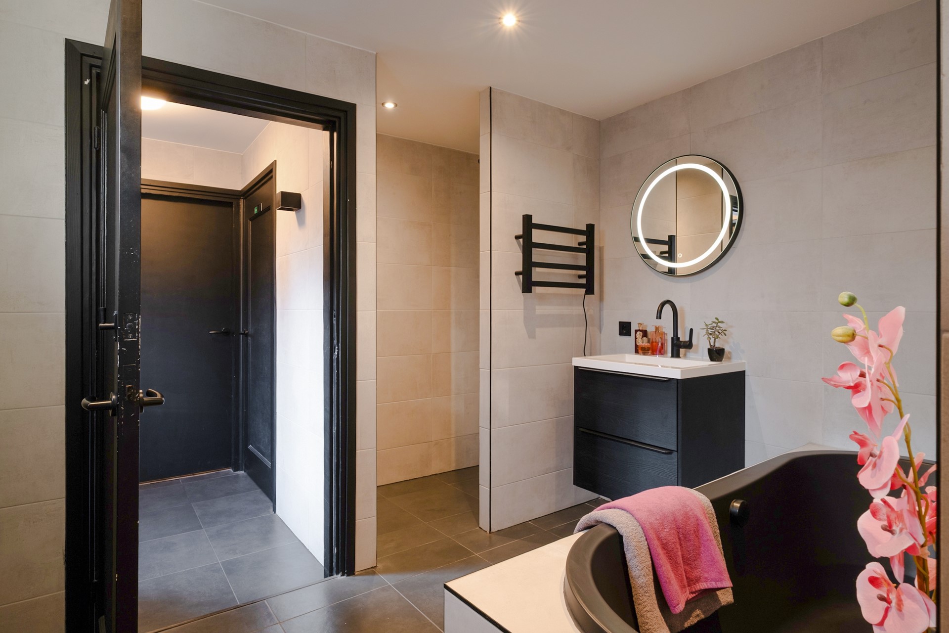 Achter in de woning ligt de hoofdslaapkamer met eigen badkamer en een separaat toilet, rustig en prettig uit het zicht. De badkamer is licht en eigentijds uitgevoerd met een inloopdouche, bad en wastafelmeubel en voelt comfortabel en verzorgd aan. Ook de slaapkamer beschikt over airconditioning met zowel koel- als verwarmingsfunctie. Vloerverwarming in zowel de slaapkamer als de badkamer zorgt hier voor extra behaaglijk wooncomfort.