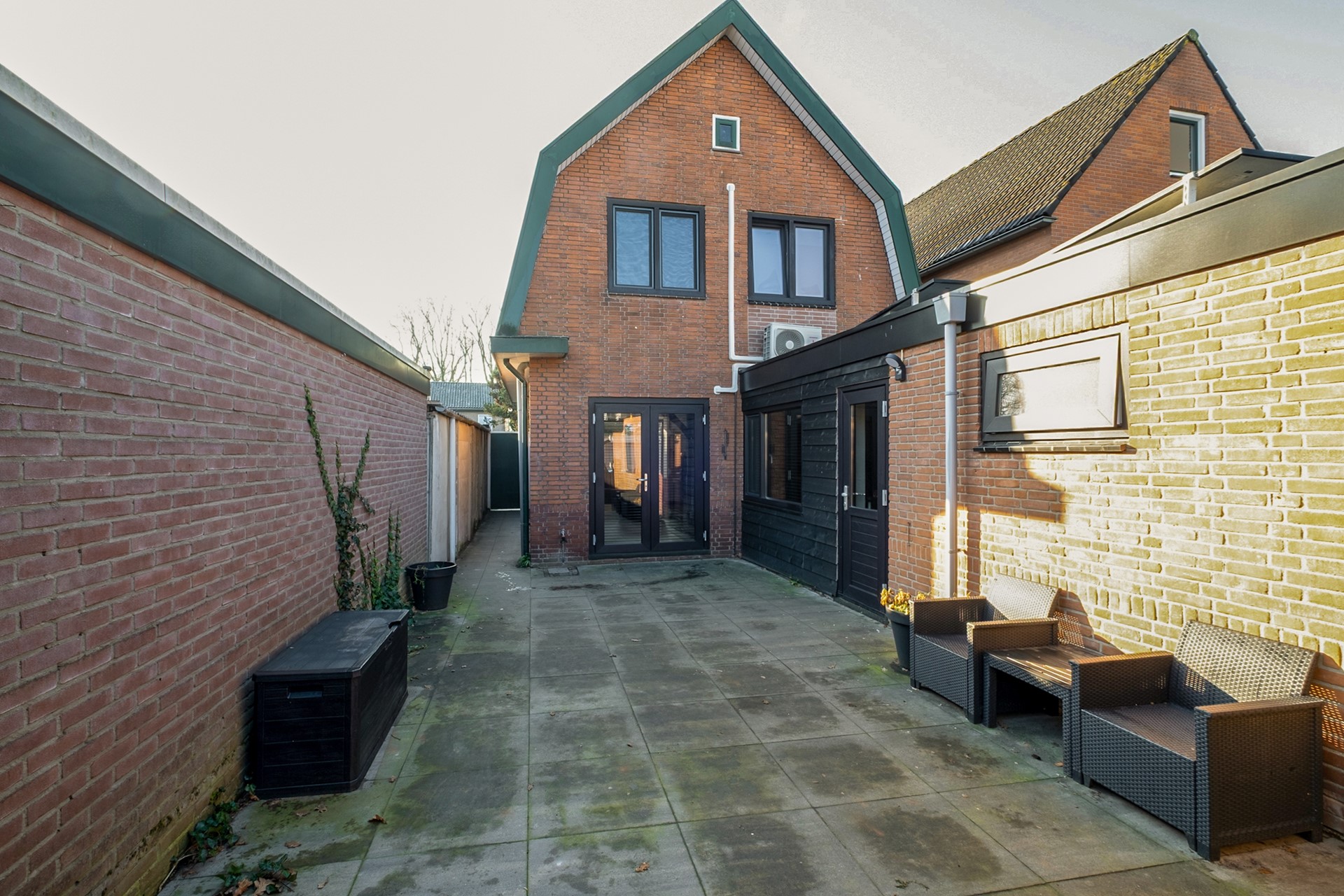 De achtertuin is strak en onderhoudsvriendelijk aangelegd met een royaal terras en een sfeervolle overkapping, waardoor je hier het hele jaar door comfortabel buiten kunt zitten. De omsloten ligging zorgt voor een prettig beschut gevoel en veel privacy.