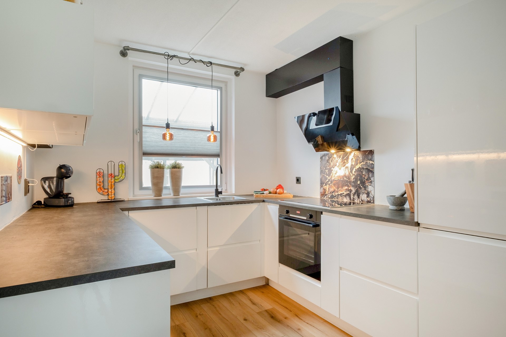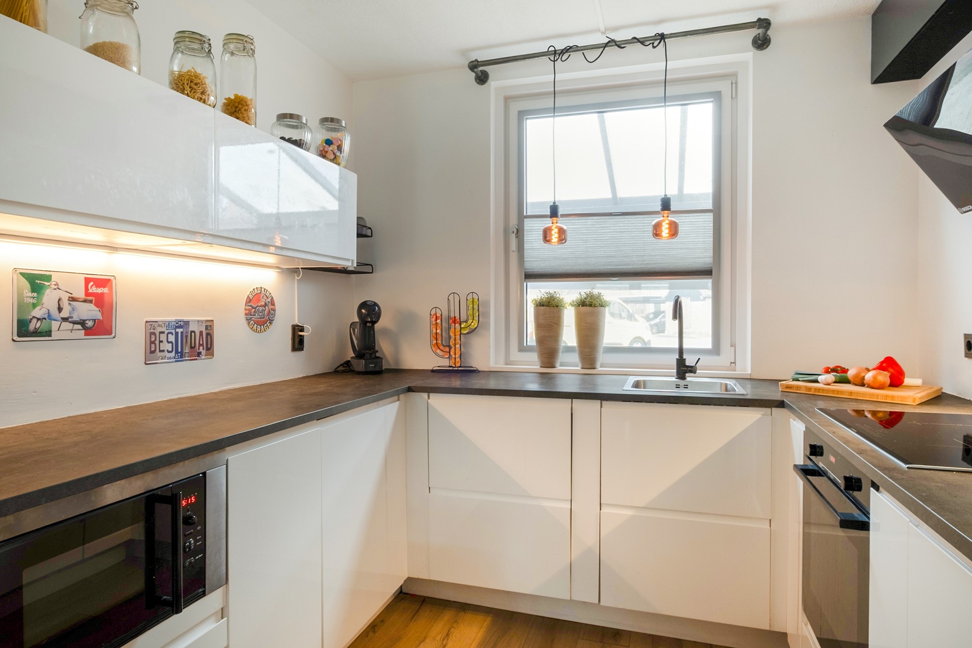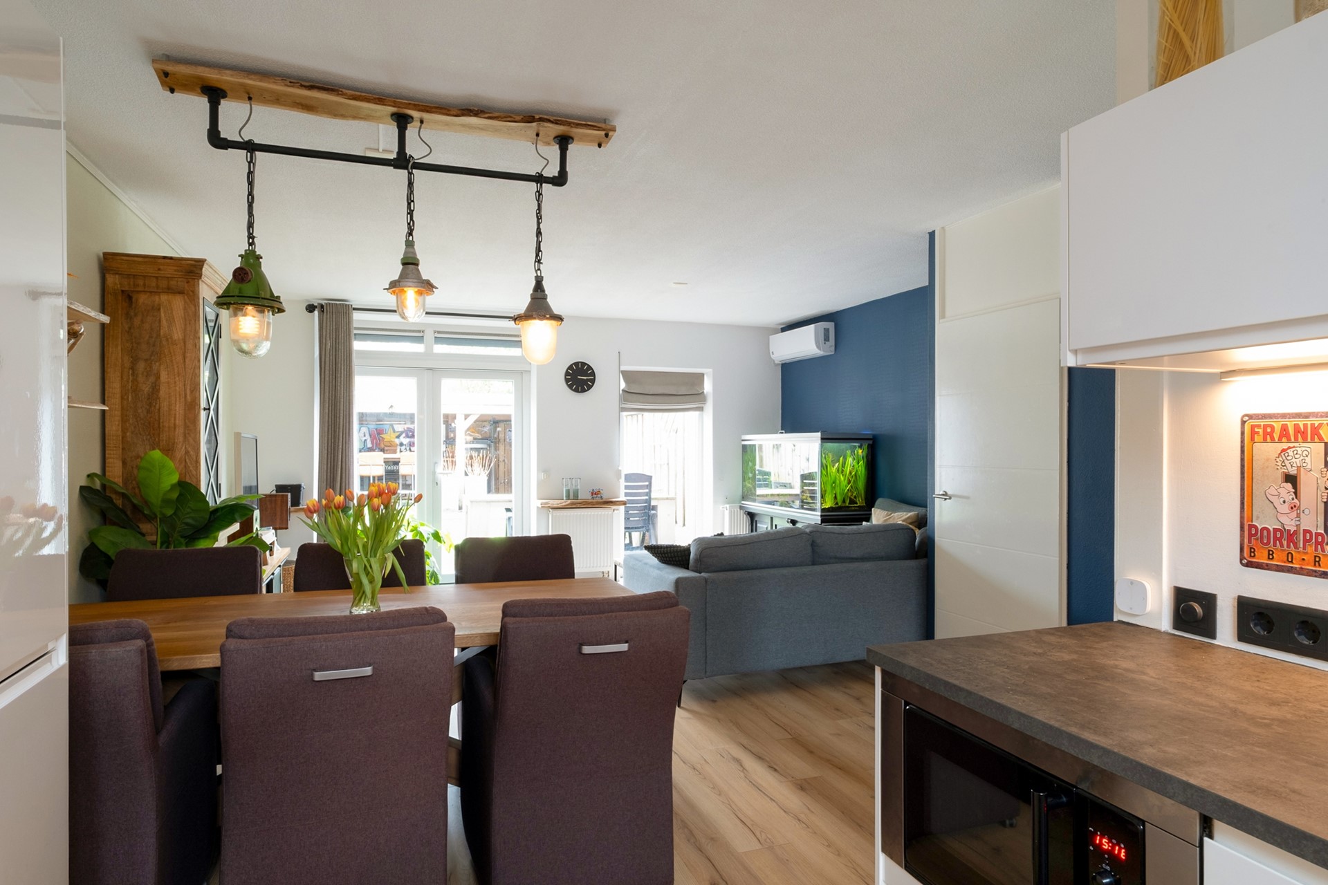 Aan de voorzijde bevindt zich de open keuken, modern uitgevoerd en voorzien van diverse inbouwapparatuur zoals een inductiekookplaat, oven, magnetron, koel-/vriescombinatie, vaatwasser en afzuigkap. Terwijl je kookt kijk je hier prettig naar buiten.