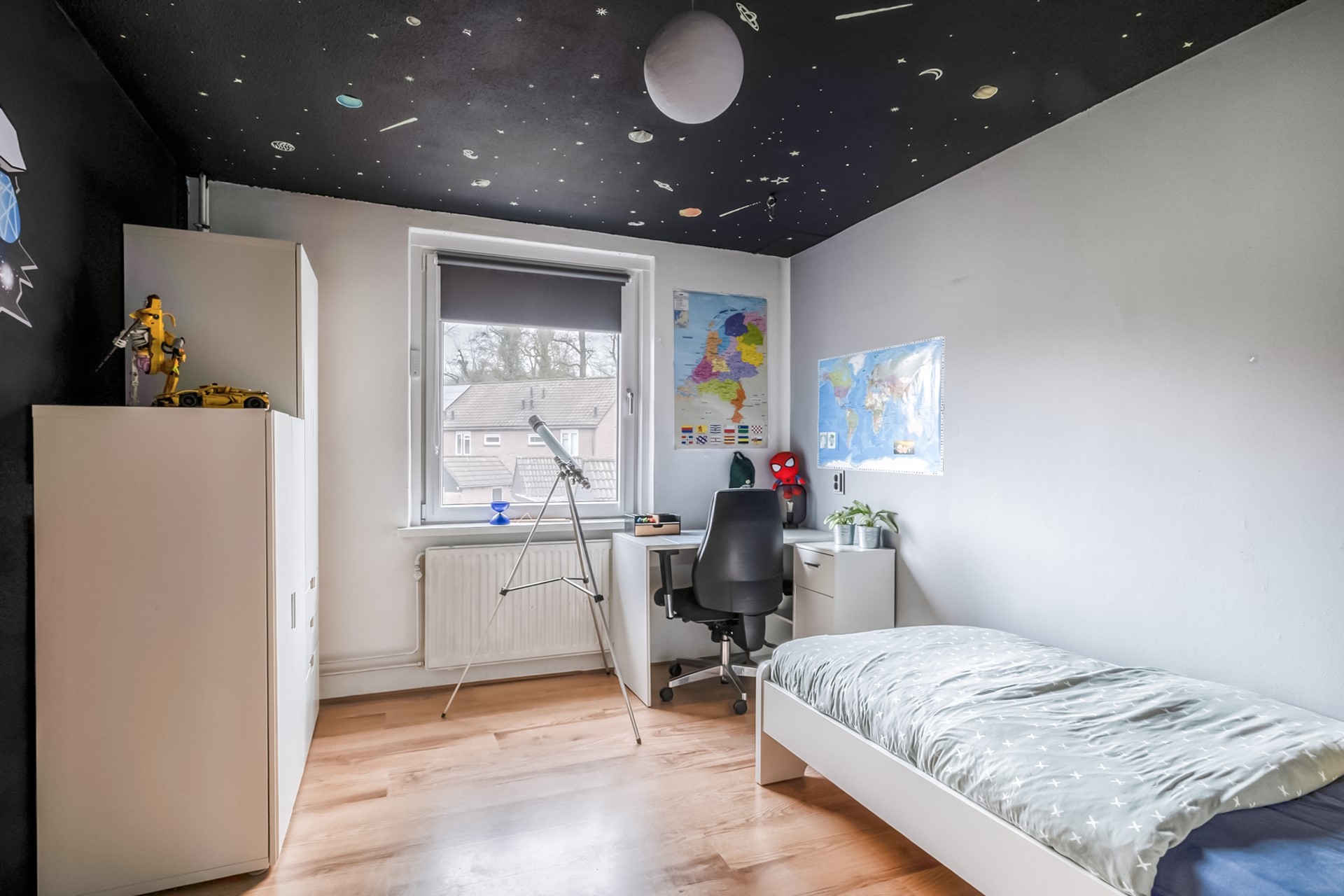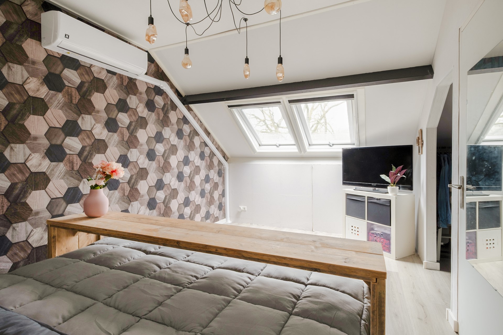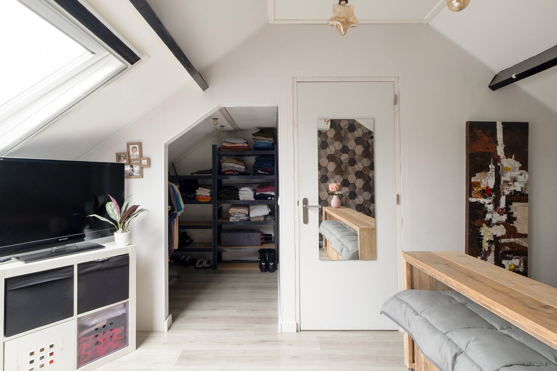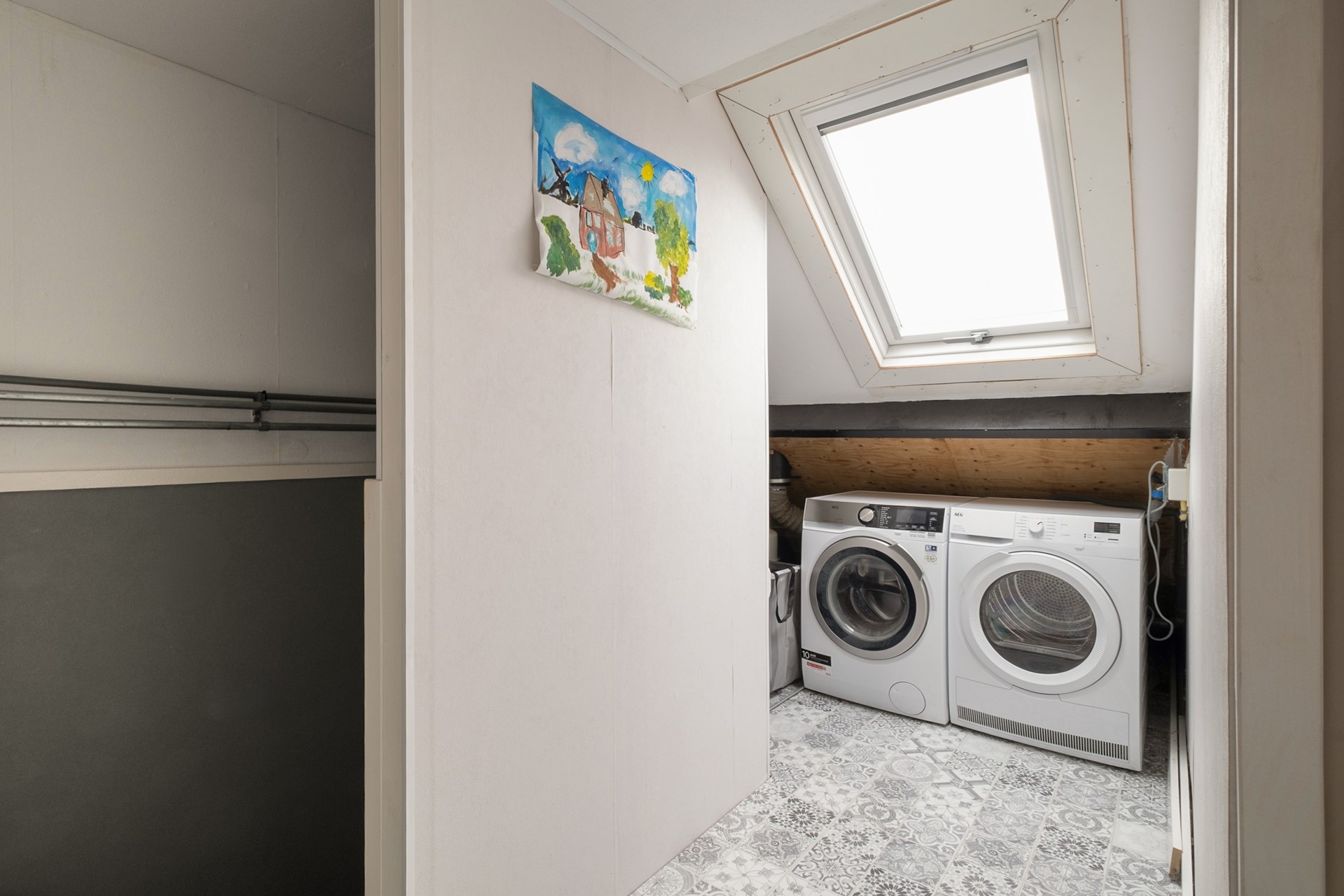 Via een vaste trap bereik je de tweede verdieping. Hier bevindt zich een ruime vierde slaapkamer met dakramen en een walk-in closet. Wat een luxe om hier zoveel ruimte te hebben. Op de overloop vind je de aansluitingen voor wasmachine en droger en de opstelplaats van de cv-ketel. Daarnaast is er extra bergruimte achter de knieschotten.
