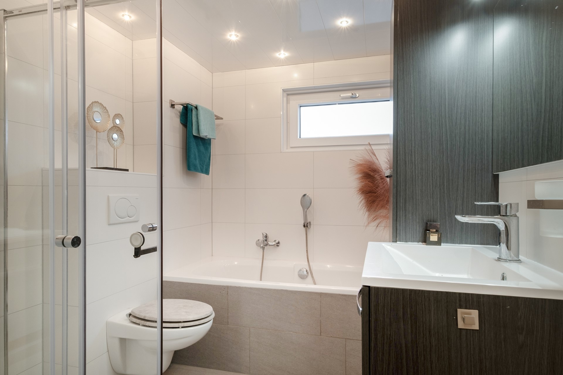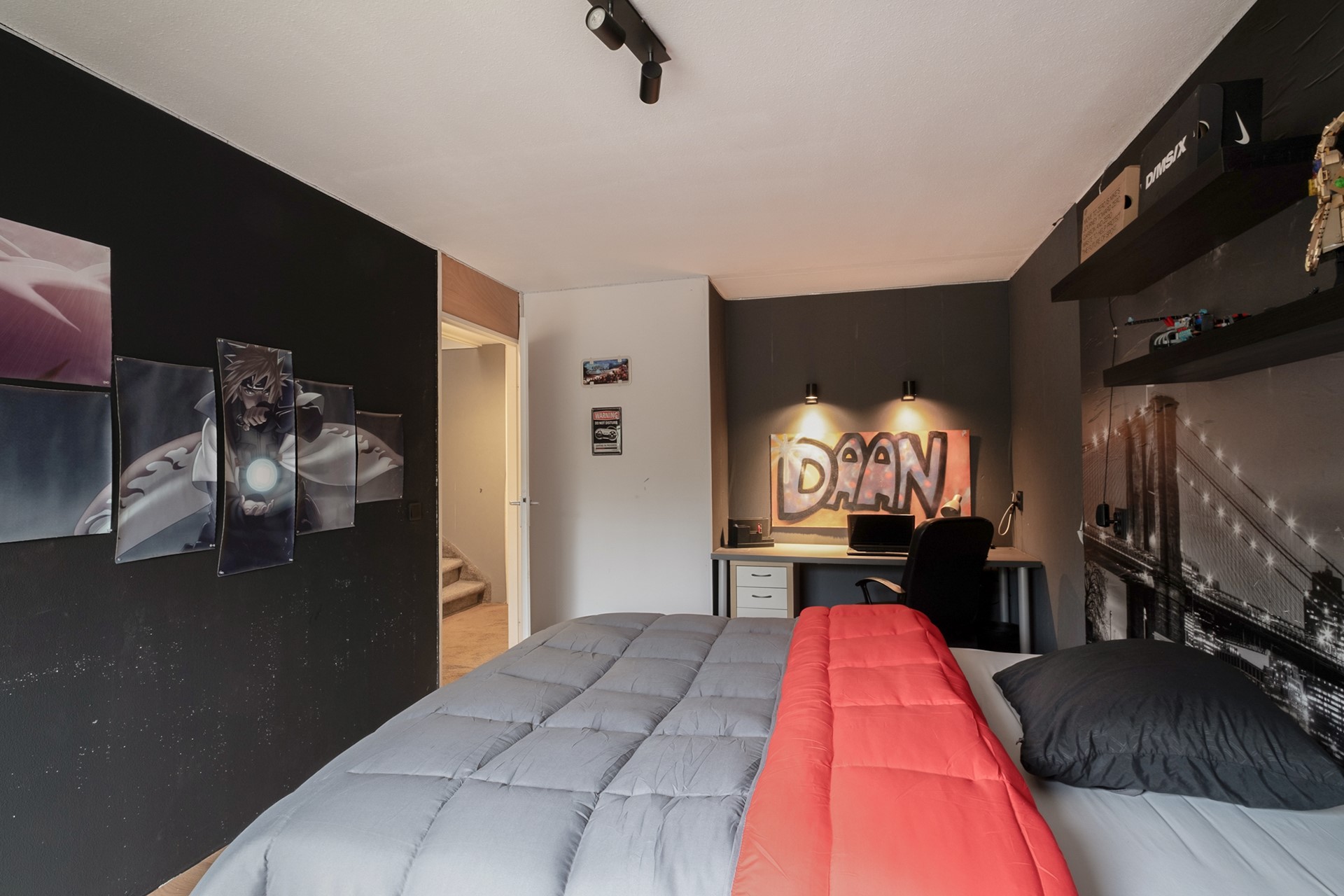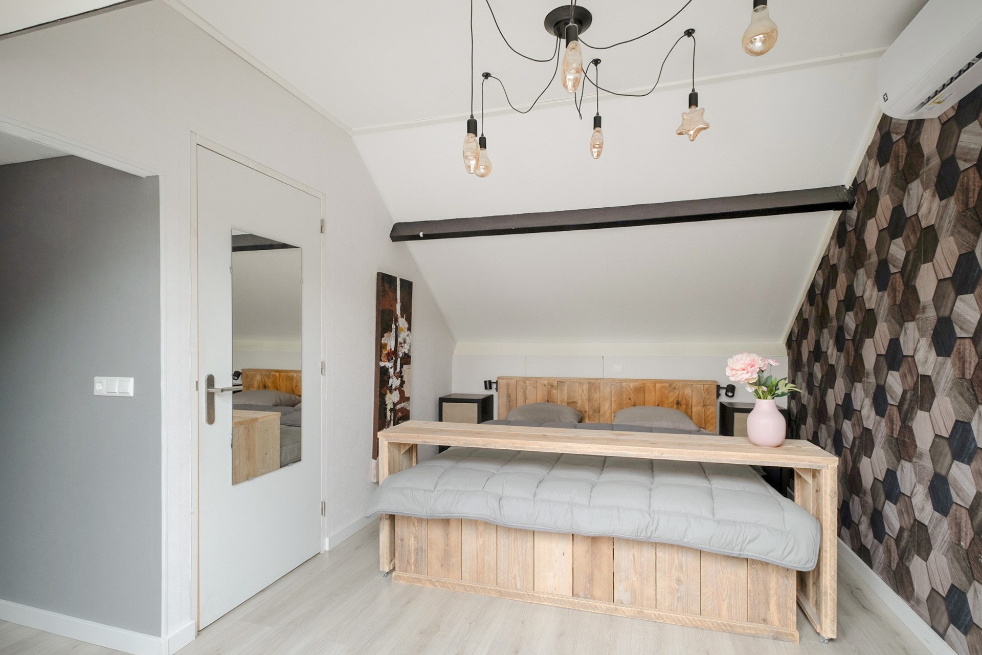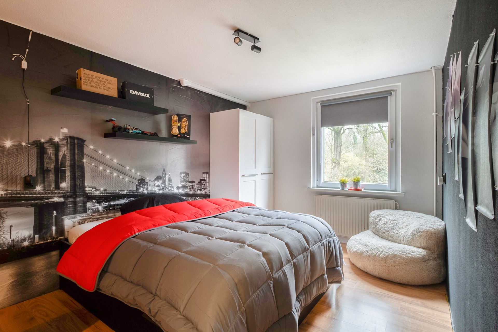 Via een vaste trap bereik je de tweede verdieping. Hier bevindt zich een ruime vierde slaapkamer met dakramen en een walk-in closet. Wat een luxe om hier zoveel ruimte te hebben. Op de overloop vind je de aansluitingen voor wasmachine en droger en de opstelplaats van de cv-ketel. Daarnaast is er extra bergruimte achter de knieschotten.