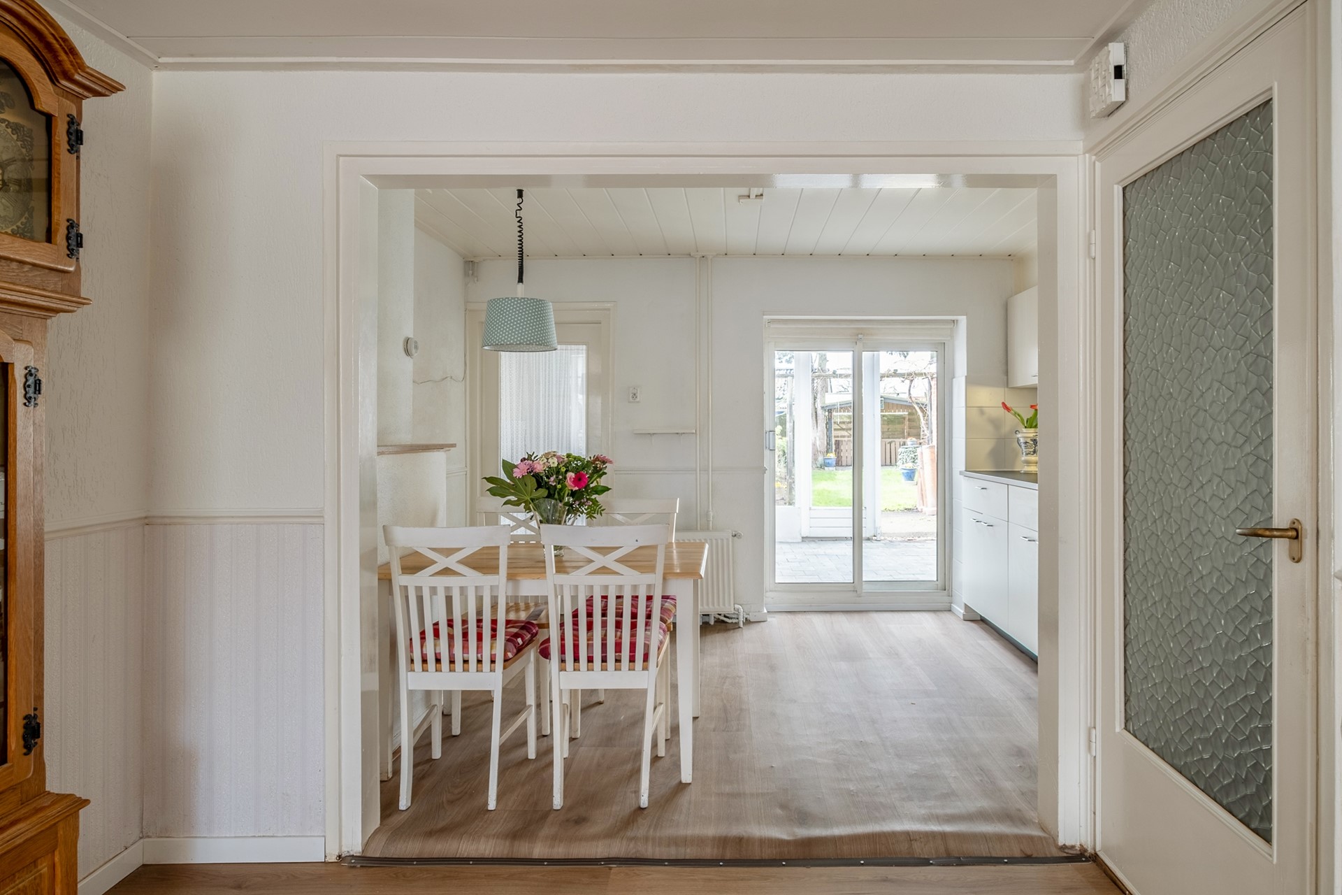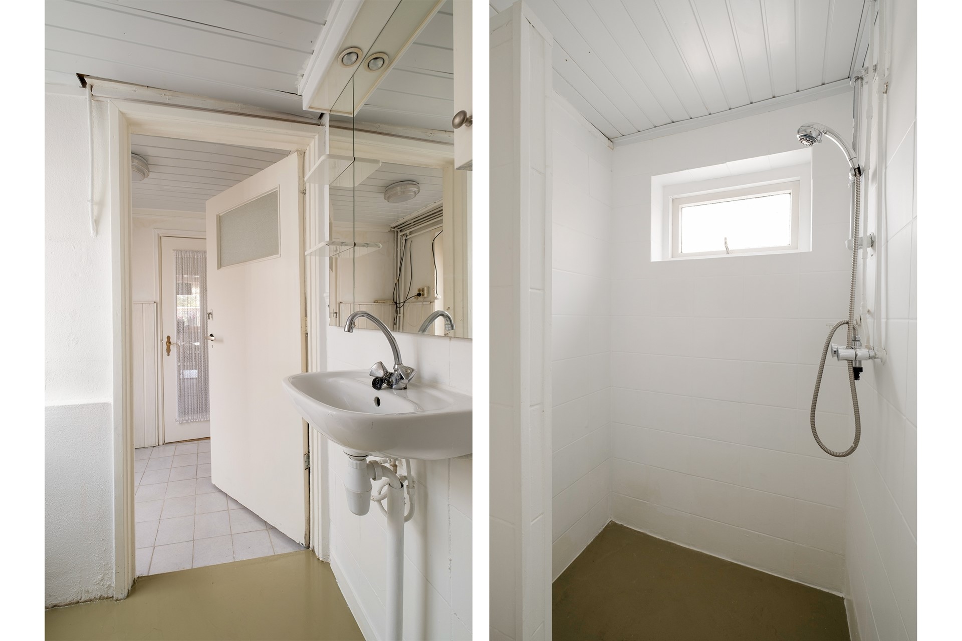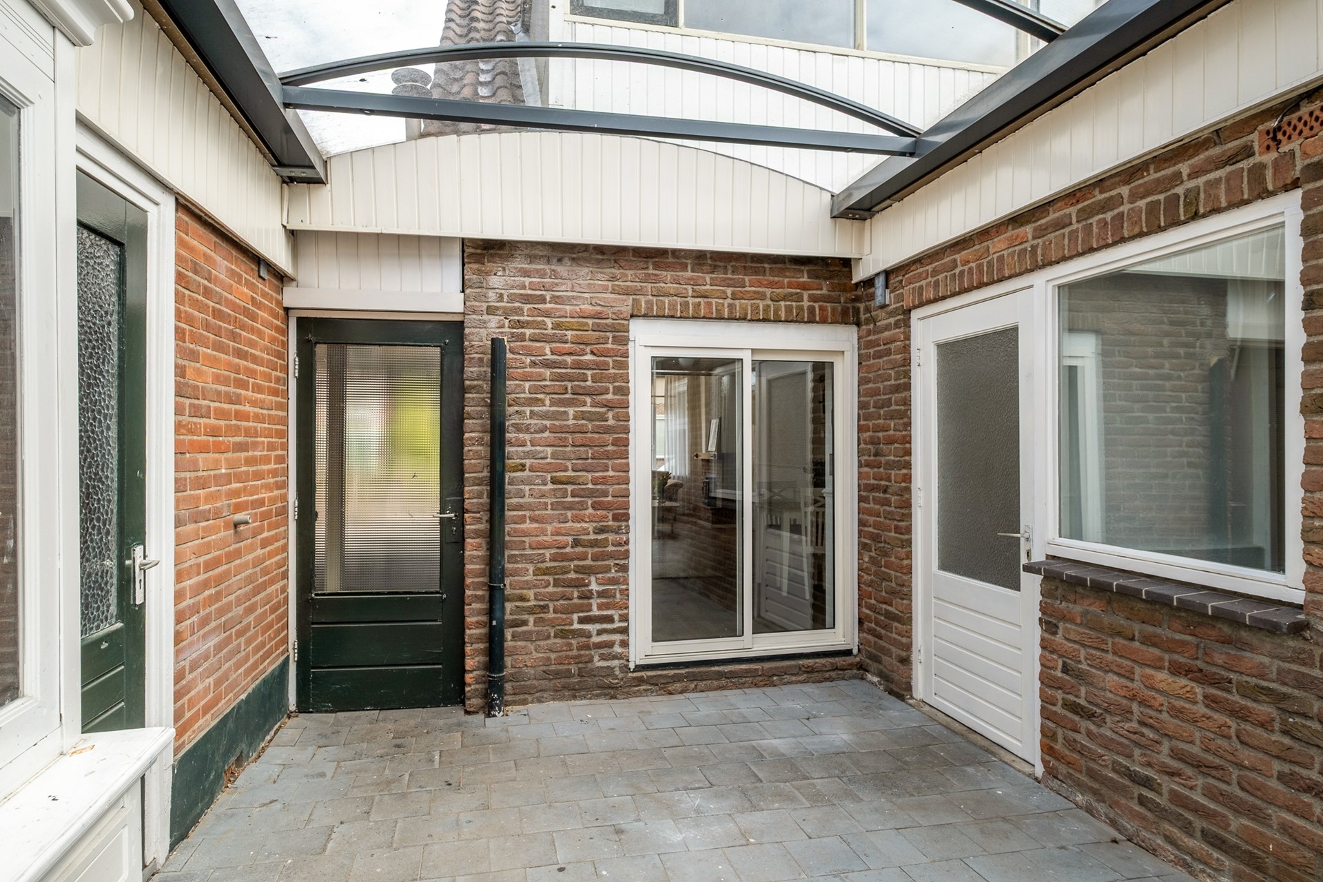 Vanuit de serre of via de gang vanuit de keuken bereik je de badkamer en heb je toegang tot de overkapping en de tuin. Ook de aangebouwde garage is vanuit hier bereikbaar, wat zorgt voor extra gemak en bergruimte.