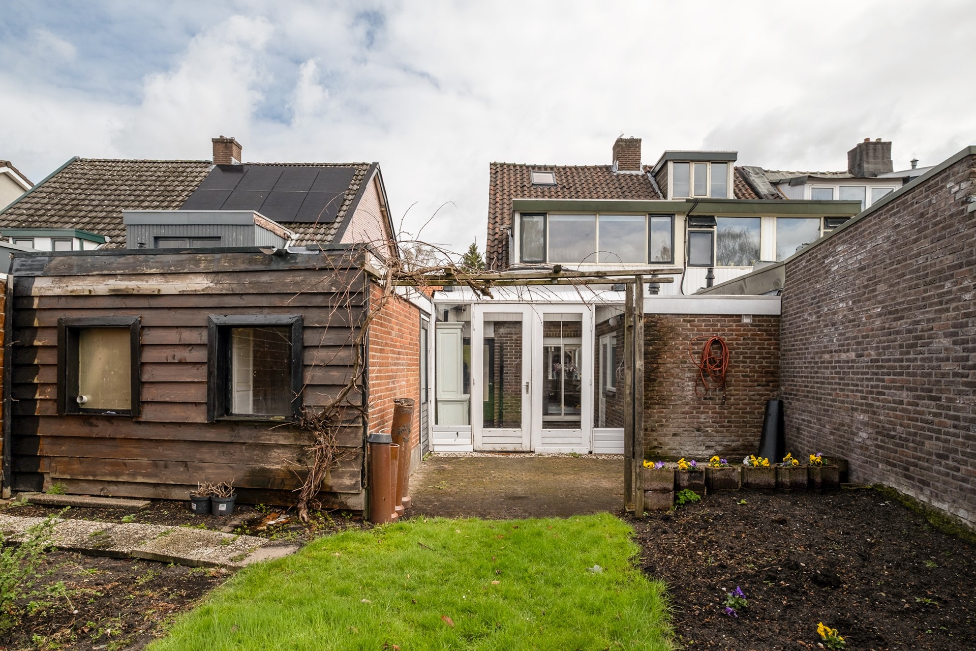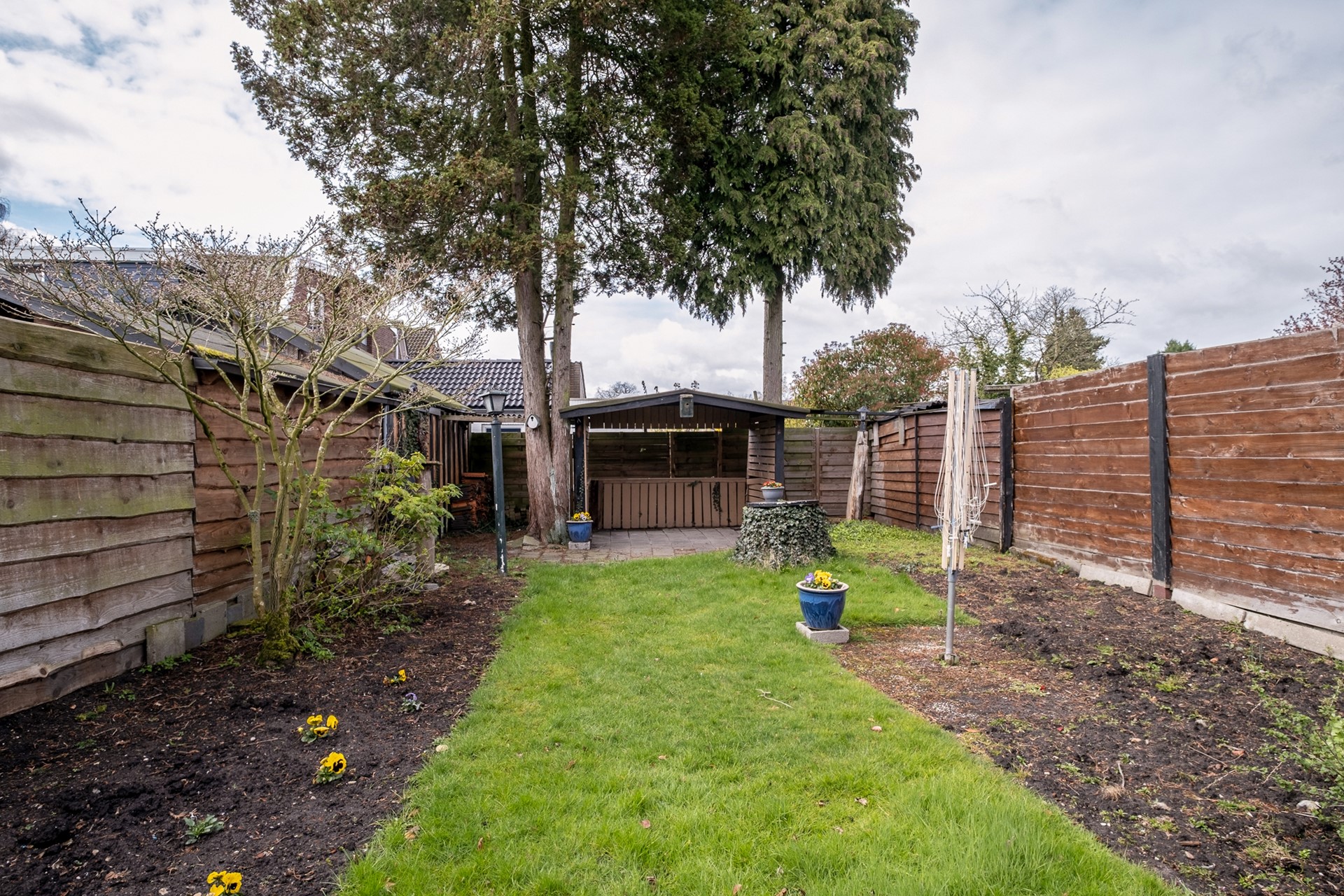De huidige inrichting geeft al een goed beeld van de mogelijkheden, maar biedt tegelijkertijd volop kansen om het geheel naar eigen wens en stijl aan te pakken. Achterin de tuin bevindt zich een houten tuinhuisje, ideaal voor opslag of hobbyruimte.