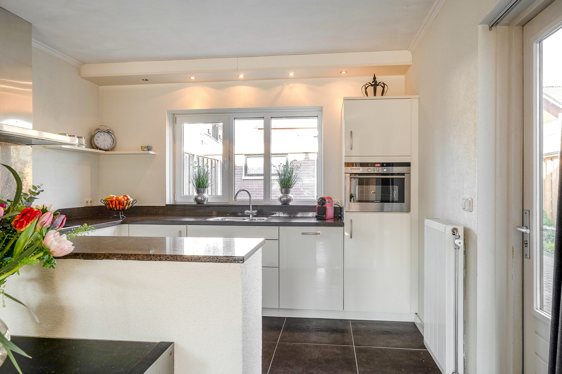 De indeling is logisch en praktisch, met voldoende ruimte voor een gezellige zithoek én een eethoek met vaste trapkast voor extra opslag. Hier hoef je niet eerst na te denken over hoe je het gaat indelen — het voelt direct goed. De moderne keuken is in 2010 vernieuwd en voorzien van diverse inbouwapparatuur. Vanuit de keuken loop je zo de besloten en verzorgde tuin in, een fijne plek om in alle rust van buiten te genieten.