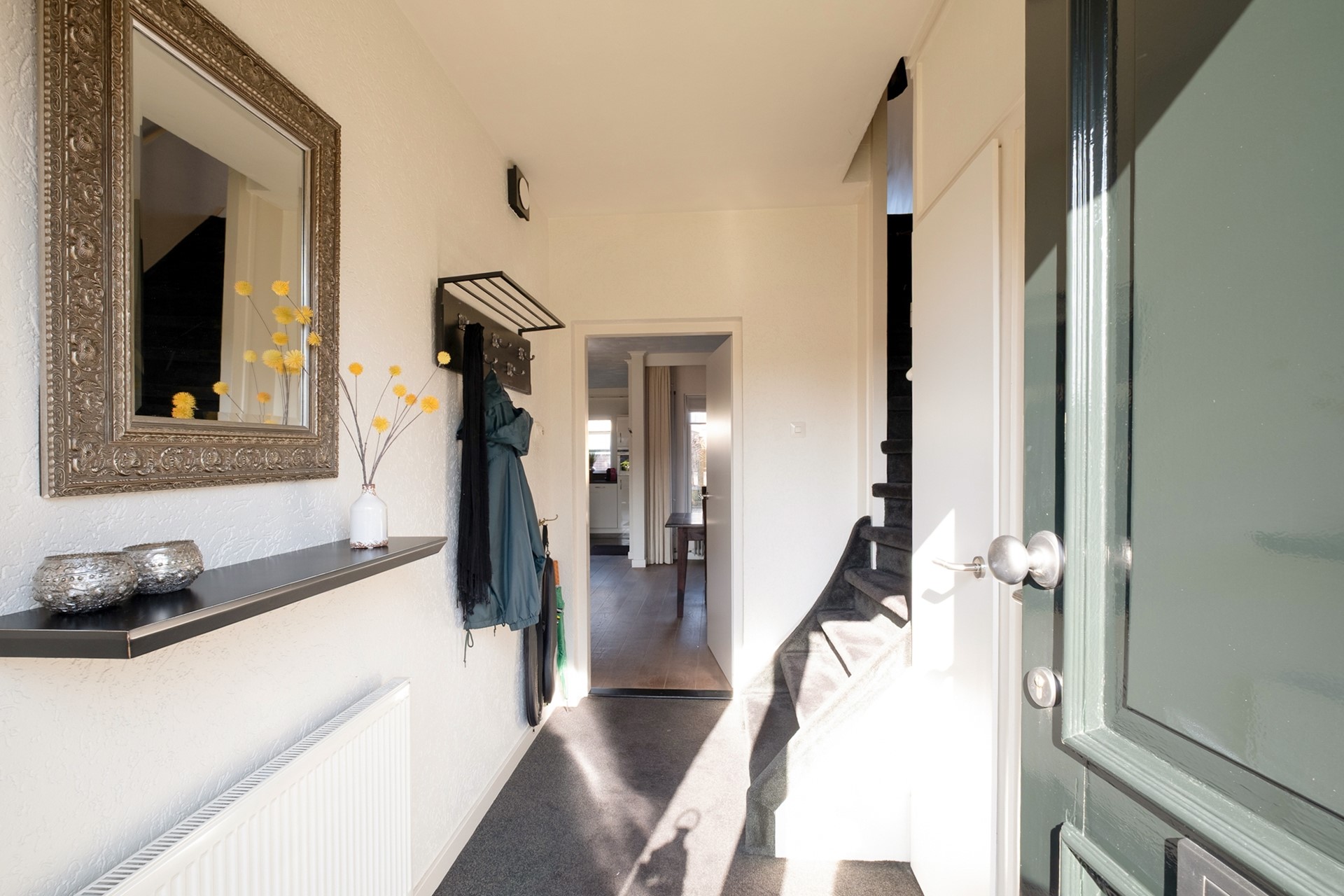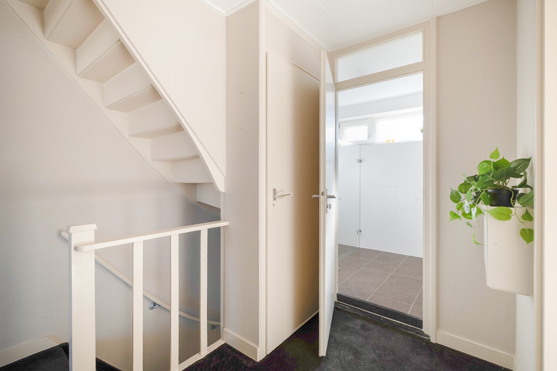 Bij binnenkomst kom je in de entree, voorzien van een modern en fris toilet, de meterkast en de trapopgang naar de verdieping. Het geheel heeft een lichte en verzorgde uitstraling, wat direct een prettige eerste indruk geeft.