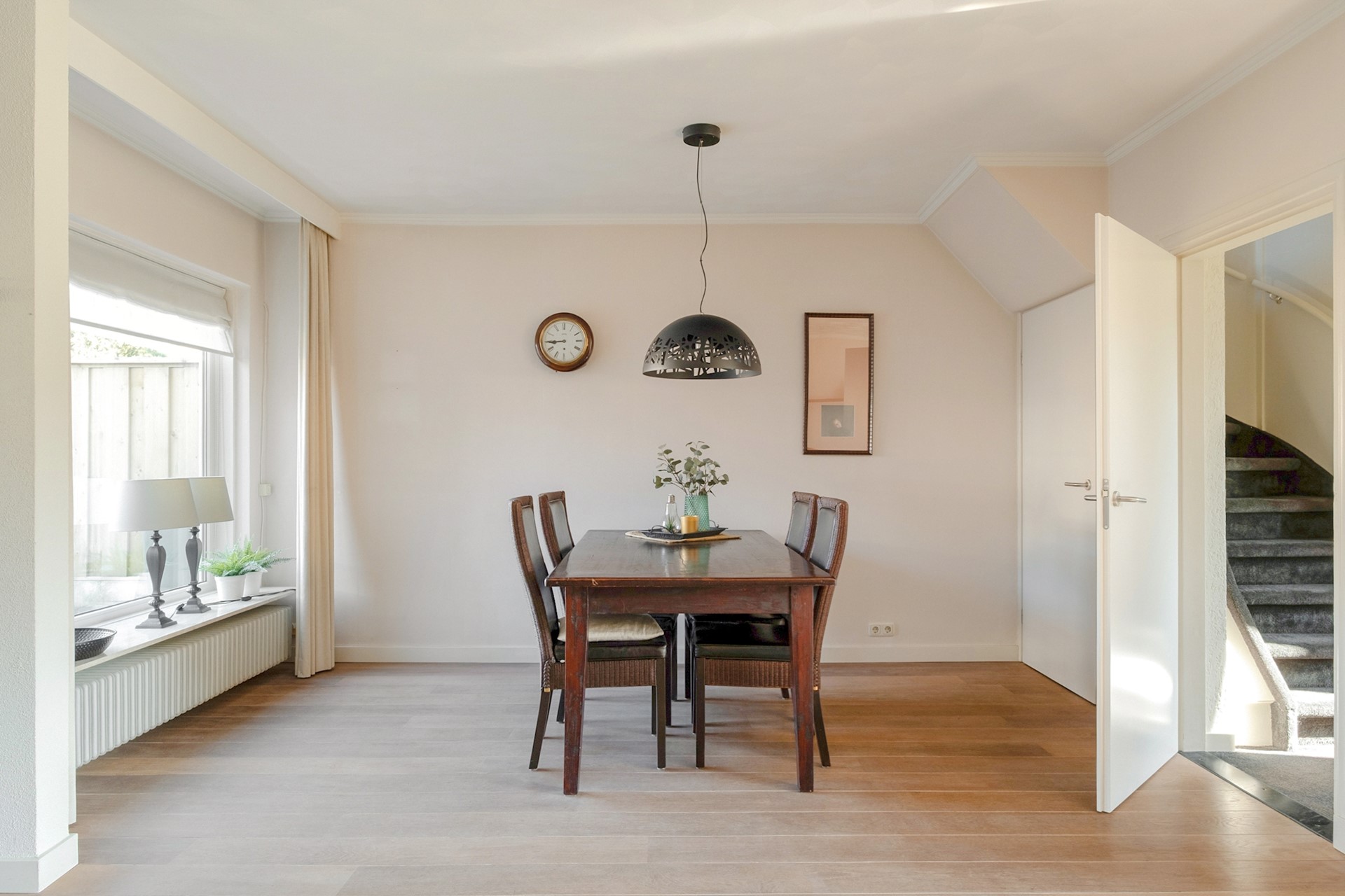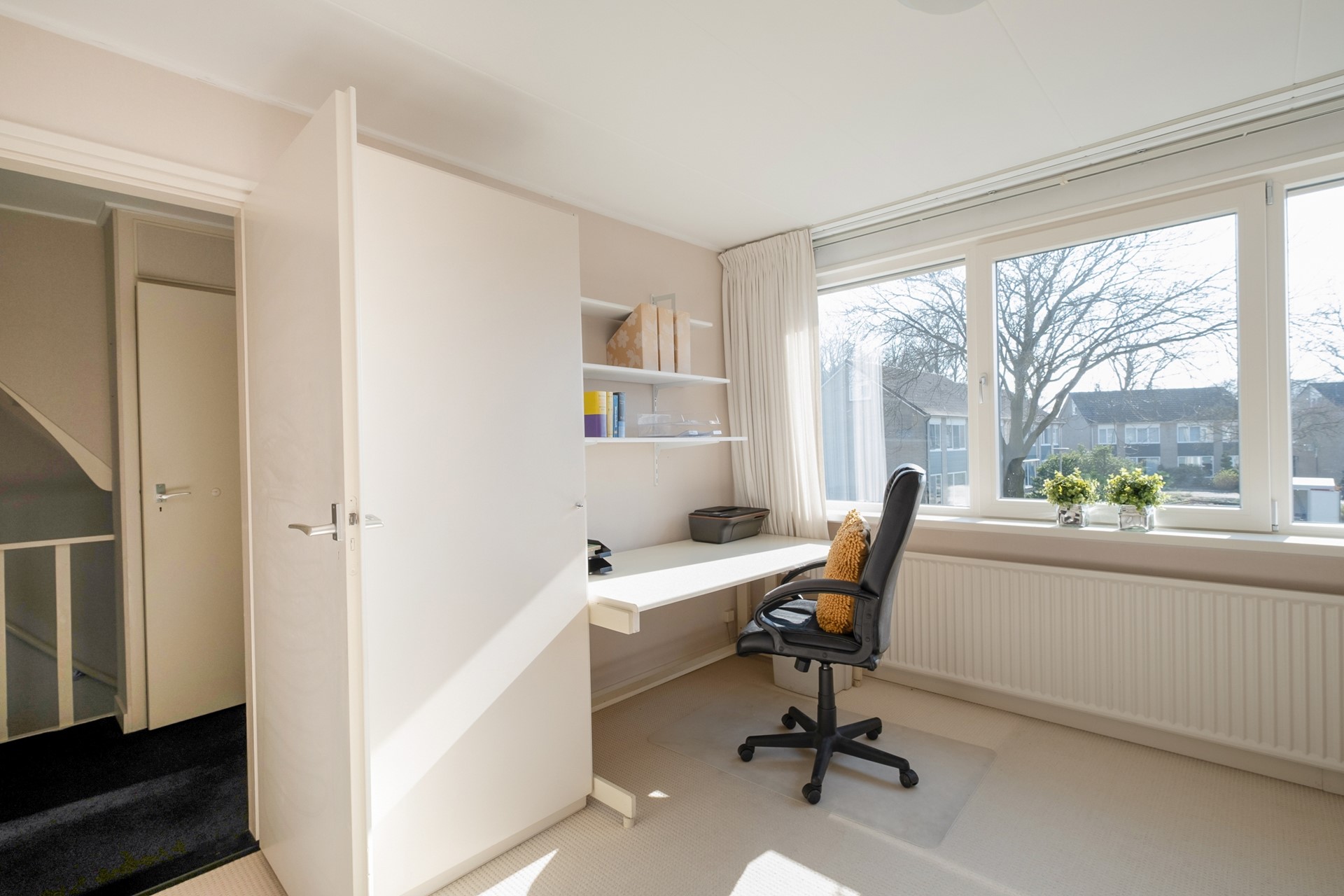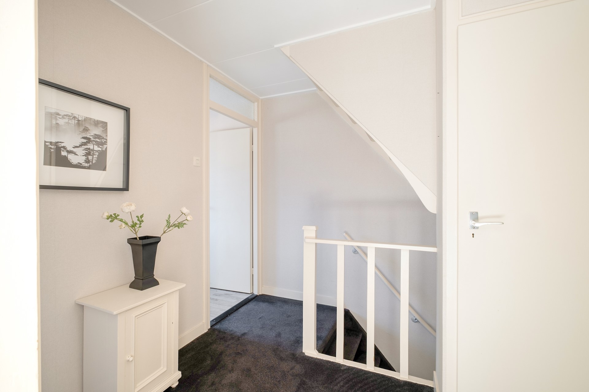 De trap naar de tweede verdieping bevindt zich netjes uit het zicht achter een deur, wat zorgt voor een rustige en opgeruimde uitstraling op de overloop.