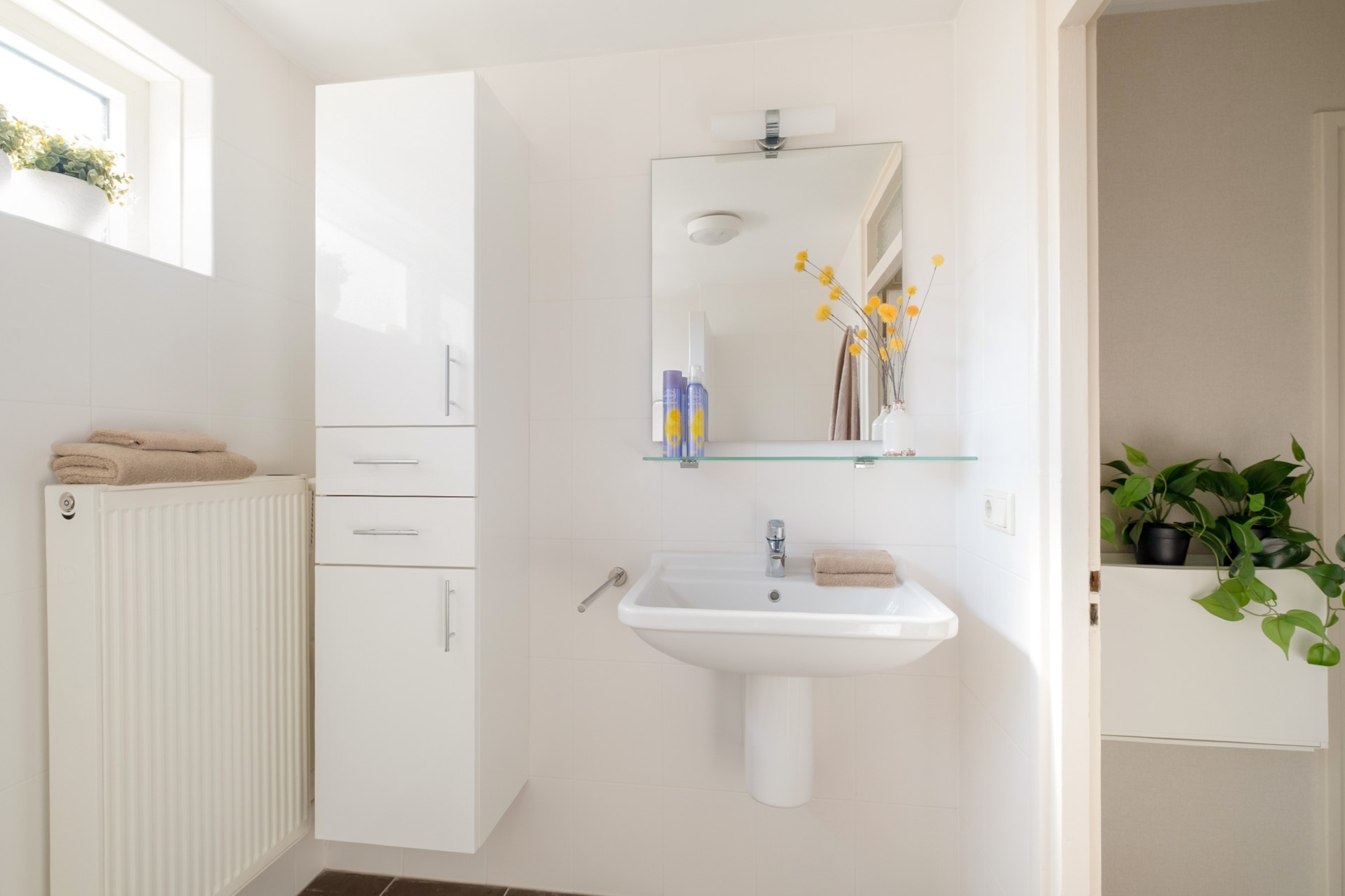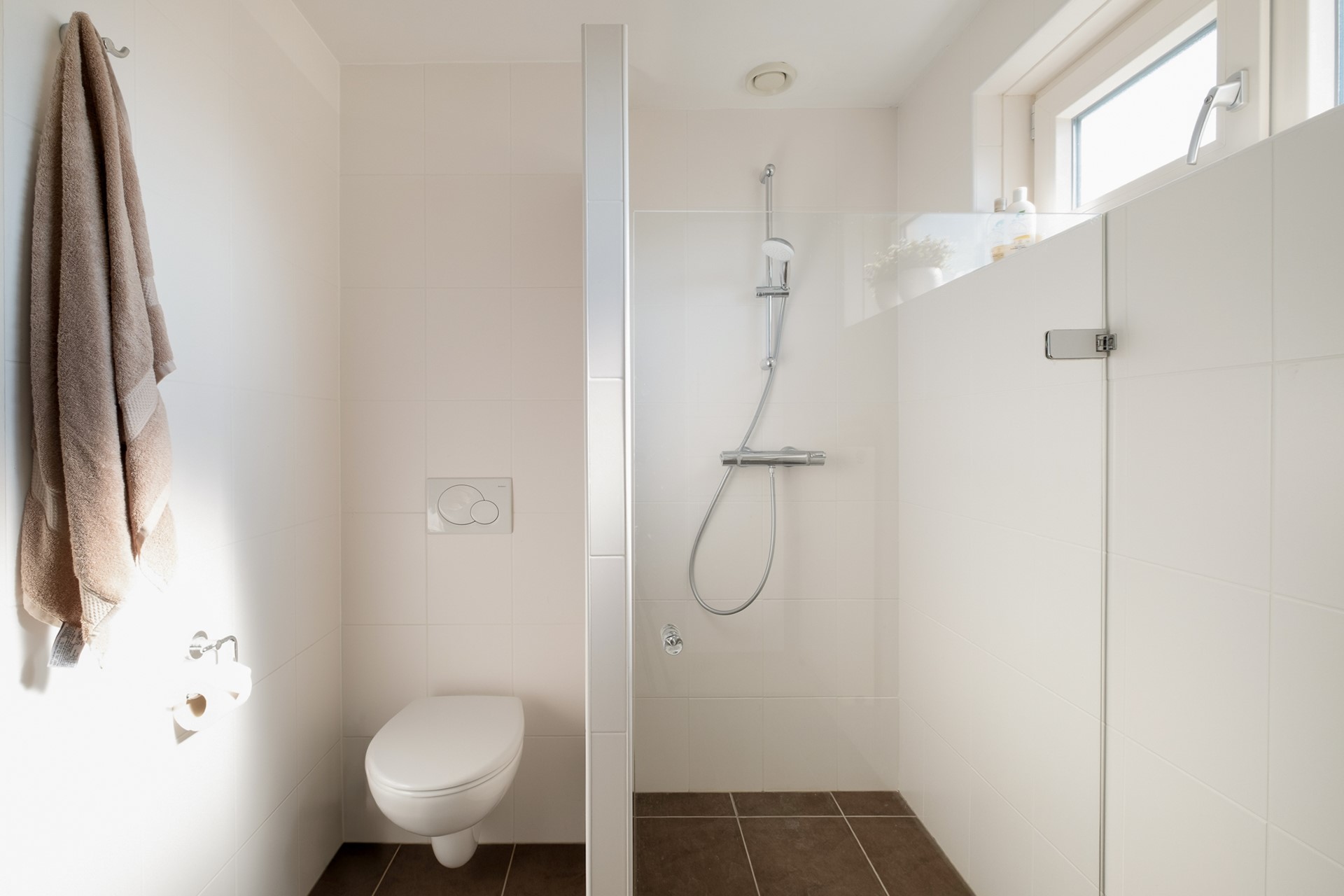 De badkamer is netjes uitgevoerd en voorzien van een inloopdouche, wastafel en toilet. Dankzij de lichte afwerking en het aanwezige daglicht oogt het geheel fris en verzorgd.