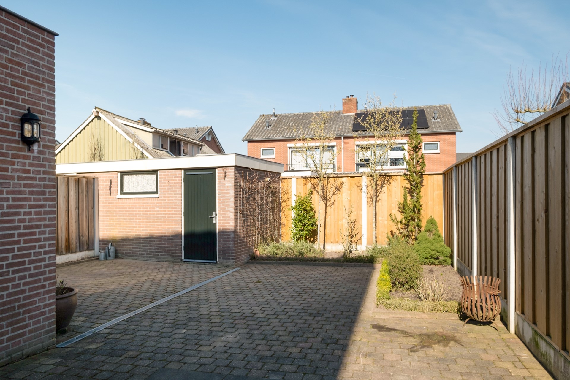 Achterin de tuin bevindt zich een vrijstaande stenen berging, perfect voor het opbergen van fietsen, gereedschap of tuinspullen. Daarnaast is de tuin voorzien van een achterom, wat het geheel extra praktisch maakt in het dagelijks gebruik.